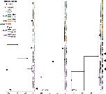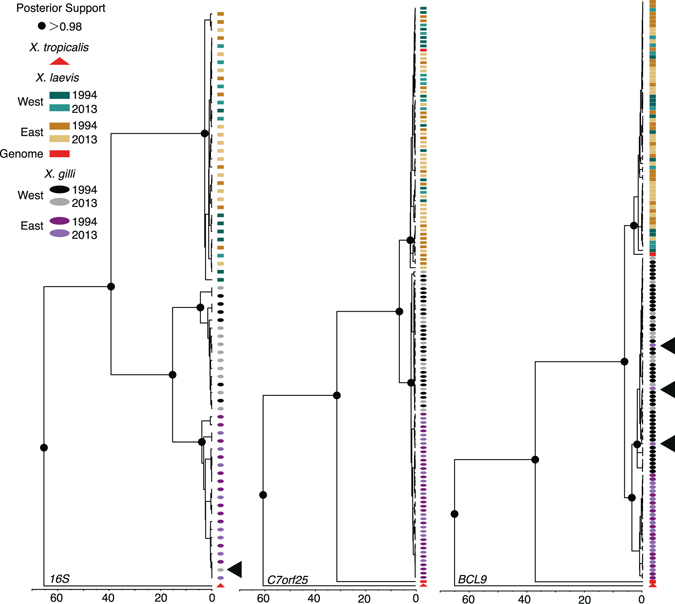 Figure 3. Representative gene trees that collectively provide no evidence of genetic exchange between X. gilli and X. laevis. The phylogeny on the left illustrates divergence between 16S rDNA mitochondrial sequences in the east and west populations of X. gilli, and with one shared sequence (indicated with an arrow) that occurred on both sides of False Bay. The nuclear phylogenies in the center and right provide examples of no shared alleles and shared alleles between the east and west X. gilli populations, respectively. Gene name acronyms are described in the Materials and Methods section. These and other phylogenies are depicted with sample labels in Fig. S1.