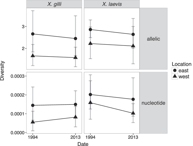 Figure 5. Genetic diversity statistics including rarefied estimates of allelic diversity (top panels) and nucleotide diversity (π) weighted by length of sequence; bottom panels). For allelic diversity, the analysis considered the same 10 loci as were analyzed by the STRUCTURE analysis (see Materials and Methods). Allelic diversity for X. laevis did not include PRMT6 locus because this locus only had four alleles for the west 1994 population.