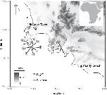 Figure 1. Sampling locations. For each species, numbers indicate the sum of number of individuals from each locality sampled in 1994 and 2013. An inset indicates the study area in southern Africa and altitude in meters is indicate on the scale. The map was made using the R package Marmap81 using topographic data from the National Oceanic and Atmospheric Administration, USA.