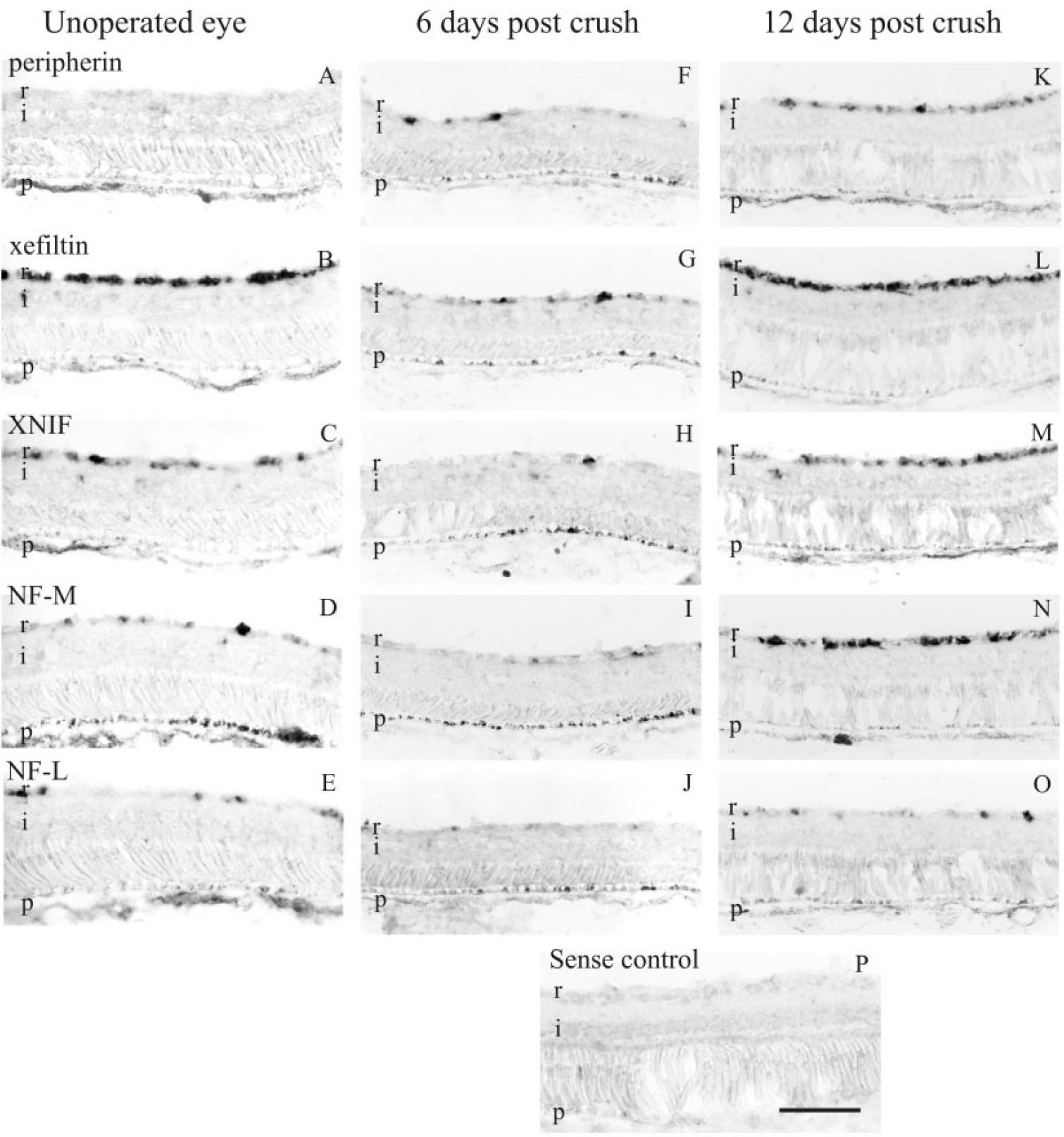 probes to peripherin (A,F,K), xefiltin (B,G,L), XNIF (C,H,M), NF-M