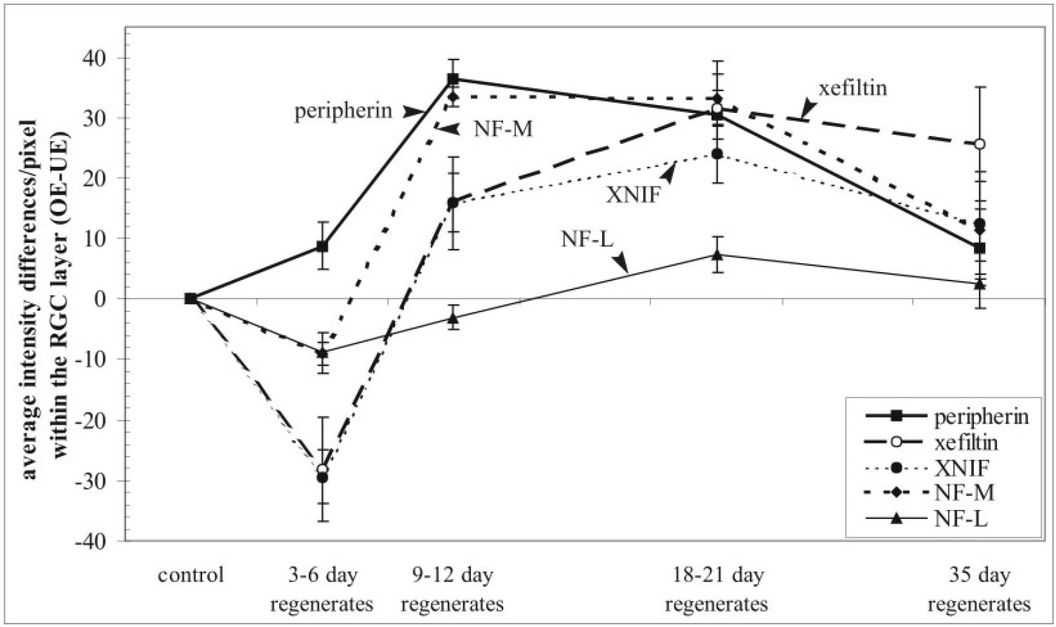 Characteristic changes in the expression of neuronal intermediate filaments (nIFs), an abundant cytoskeletal component of vertebrate axons, accompany successful axon regeneration. In mammalian regenerating PNS, expression of nIFs that are characteristic of mature neurons becomes suppressed throughout regeneration, whereas that of peripherin, which is abundant in developing axons, increases. Comparable changes are absent from mammalian injured CNS; but in goldfish and lamprey CNS, expression of several nIFs increases during axon regrowth. To obtain a broader view of the nIF response of successfully regenerating vertebrate CNS, in situ hybridization and video densitometry were used to track multiple nIF mRNAs during optic axon regeneration in Xenopus laevis. As in other successfully regenerating systems, peripherin expression increased rapidly after injury and expression of those nIFs characteristic of mature retinal ganglion cells decreased. Unlike the decrease in nIF mRNAs of regenerating PNS, that of Xenopus retinal ganglion cells was transient, with most nIF mRNAs increasing above normal during axon regrowth. At the peak of regeneration, increases in each nIF mRNA resulted in a doubling of the total amount of nIF mRNA, as well as a shift in the relative proportions contributed by each nIF. The relative proportions of peripherin and NF-M increased above normal, whereas proportions of xefiltin and NF-L decreased and that of XNIF remained the same. The increases in peripherin and NF-M mRNAs were accompanied by increases in protein. These results are consistent with the hypothesis that successful axon regeneration involves changes in nIF subunit composition conducive to growth and argue that a successful injury response differs between CNS and PNS.
