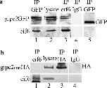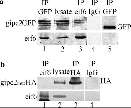 Co-immunoprecipitations of eif6 and gipc2 and of eif6 and gipc2mut. a. We utilized lysates of embryos injected with pCS2gipc2GFP. IP experiments were performed using anti-GFP antibodies for immunoprecipitation and anti-gipc2 and anti-eif6 antibodies for western blots. In western blots of the immunoprecipitations, the eif6 protein was found in the sample immunoprecipitated with anti-GFP (lane 1) and GFP was found in the sample immunoprecipitated with anti-eif6 (lane 3), indicating that eif6 and gipc2 co-immunoprecipitate. Lane 2=embryo lysate. In control IP using unrelated IgG the gipc2GFP and the eif6 bands are absent (lane 4). Lane 5=only an anti-GFP immunopositive band is present in the immunoprecipitate derived from lysates of pCS2GFP-injected embryos. b. We utilized lysates of embryos injected with pCS2gipc2mutHA (gipc2mut = gipc2 with PDZ domain deletion) to perform the IP experiments using anti-HA and anti-eif6 antibodies. The blots indicate that while in the lysates both eif6 and gipc2mutHA are present (lane 2), this does not occur in the reciprocal IPs, i.e., the gipc2mutHA band is absent in anti-eif6 IP (lane 1), and the eif6 band is absent in the anti-HA IP (lane 3). Therefore, gipc2mutHA does not interact with eif6. Lane 4=control IP using unrelated IgG: no bands are present.