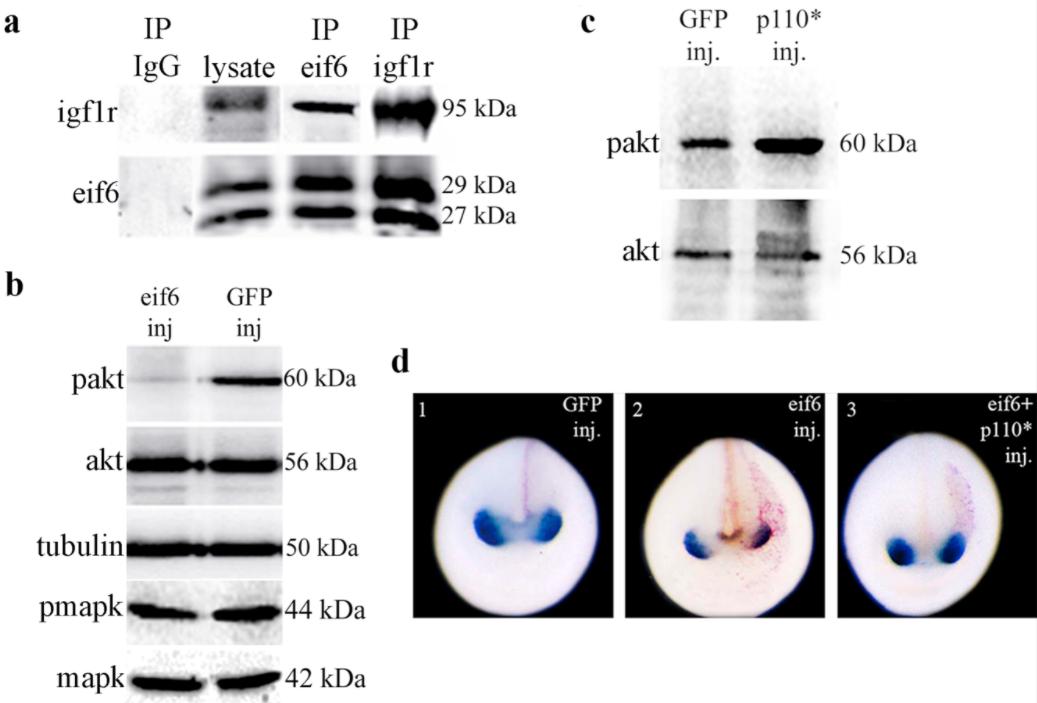 eif6 interaction with the igf pathway. a. Co-immunoprecipitation using anti-eIF6 or anti-IGFR. The two isoforms of eif6 are immunoprecipitated by anti-IGFR and igfr is immunoprecipitated by anti-eIF6, in contrast to the control immunoprecipitation using IgG. b. Immunoblots of eif6-injected embryos or of GFP-injected embryos. Anti-AKT or anti-pAKT, as well as anti-pMAPK or anti-MAPK, were used: there is a clear decrease in pakt level in eif6-injected embryos compared to GFP-injected embryos. In contrast, in embryos injected with eif6 or with GFP no difference is observed between pmapk and mapK levels. Normalization was performed with anti-tubulin. c. Animal caps lysates of embryos injected with p110* of the PI3 kinase were analyzed. pAkt level is higher in embryos injected with p110* than in those injected with GFP. d.In situ hybridizations of neurula embryos using rax1 riboprobe. The hybridization by this marker specific for the eye indicates the extension of the eye field in the observed embryos. 1. Control embryos injected with GFP showing that the rax1 hybridization extension is practically identical in both sides of the embryo. 2. The side of the embryo injected with eif6 shows a rax1 hybridization less extended than the un-injected side. 3. In the embryo side co-injected with p110* and eif6 the eye field stained by rax1 is practically identical in both sides of the embryo indicating that a partial rescue of the eye field occurs in these embryos. Rescue means a partial or total recovery of the hybridization extension as found in the eye-field of the embryo un-injected side. βgal mRNA was visualized with Red-Gal.