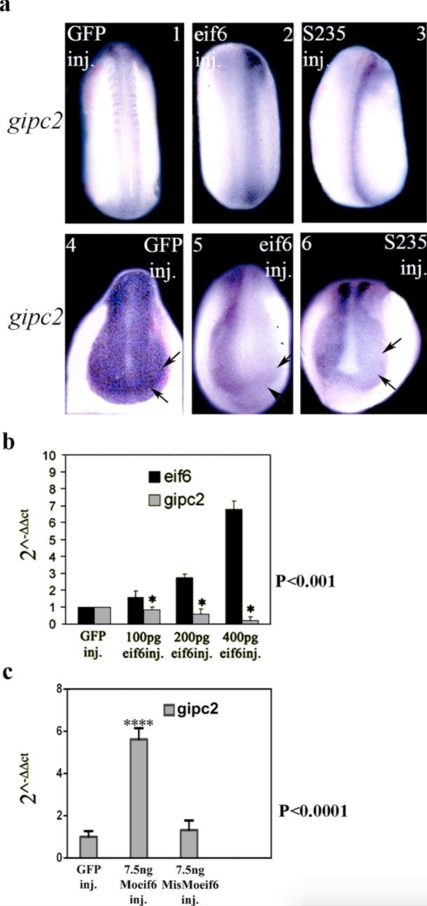 Relationship between eif6 and gipc2 expression. a. In situ hybridization performed using gipc2 anti-sense RNA on neurula injected at the 2 cell stage in one blastomere with either GFP (1 and 4), eif6 (2 and 5) or S235A (3 and 6). In GFP injected embryos (1 and 4), the hybridization intensity and pattern is identical in the embryo dorsal portion (1) and in the eye field territory (4, arrows) of both sides. In both eif6 (2 and 5) and S235A (3â6) injected samples, gipc2 is expressed at a lower level in the injected side than in the un-injected side, in particular in the eye field territory (arrows). βgal mRNA was visualized with Red-Gal. b. Real-time PCR using embryos injected with increasing concentration of eif6 (100, 200 and 400 pg) shows a highly significant (P<0.001) dose-dependent decrease of gipc2 mRNA. c. Real-time PCR in eif6 morphants showing a highly significant increase of gipc2 mRNA (P<0001) in contrast to the control mis-paired morpholino.