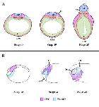 Fig. 1. Origin and migration of the cranial neural crest cells in Xenopus laevis. (A) Schematics representing transverse sections though the prospective otic placode (Ot) of Xenopus embryos at the various stages of development ( Nieuwkoop and Faber, 1967). Dorsal is up. The placodal ectoderm and neural crest prospective tissue emerge from the sensory layer of the ectoderm and are anatomically visible as soon as stage 14 (early neurulation). At stage 19 (late neurula stage) the cranial neural crest starts migrating ventrally (Sadaghiani and Thiebaud, 1987). (B) Schematic showing the relative positioning of CNC and the cranial placodes ( Sadaghiani and Thiebaud, 1987 ; Schlosser, 2006). During the early neurula stage (stage 15) both placodal (blue) and CNC (pink) primordium appose one another. Starting with the early tailbud stage (stage 21), these territories are segmented into various subgroups that reflect their future differentiation. The placodal ectoderm secretes Sdf1, which attracts CNC. Once the CNC reaches a placode, CIL takes place and the placode migrates away (i.e. ventrally). Once the placodes and CNC are separated, the Sdf1-based chemoattraction reasserts itself. This âchase and runâ contributes to the proper migration of the each of the CNC segments while the placodes lying in the path of the CNC (e.g. Epibranchial placodes) reach their proper dorsoventral location and are shaped into narrow strips of tissues. Ot: Placode; NT, neural tube; n: notochord; psm: presomitic mesoderm, so: somites; LPM: lateral plate mesoderm, CG: cement gland; Op: optic vesicle. |