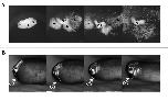 Fig. 2. Migration of CNC cells in vitro and in vivo. GFP expressing CNC are explanted at stage 15 and either grown on a substrate of fibronectin in a saline media (A) or grafted into a wild type embryo (B) (anterior left, dorsal top). The migration of the CNC is followed by time-lapse photography (3 minute intervals, 10 h of total migration) and still pictures from these movies were extracted at regular time points throughout the movies. The migration of CNC in vitro (A) recapitulates the migration of the CNC observed in vivo (B) including the formation of segments (mandibular, hyoid, branchial), and the collective migration which is observed in the first 3 frames and the single cell migration which is observed in the last frame. Note that the explant in A was cut purposely large to demonstrate the formation of segments and therefore contains some neural tissue contaminant (NT). m: mandibular; h: hyoid segment b: branchial segments (b, b1, b2); CG: cement gland. |