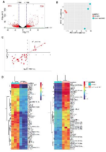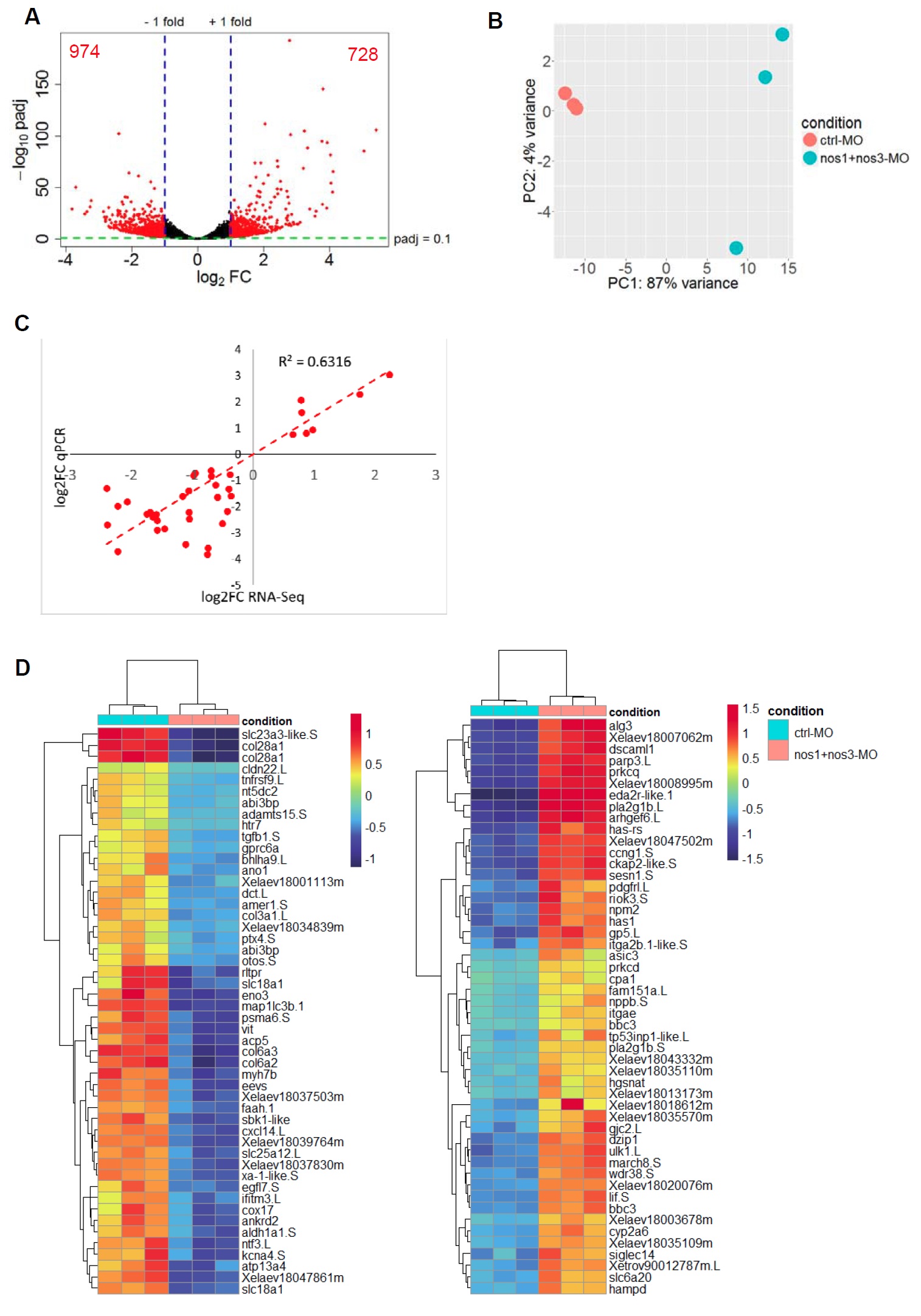 Fig. S1. Whole transcriptome RNA-seq profile of Xenopus embryos after inhibition of NO. Volcano plot of results from DESeq2. Highlighted dots represent significant transcripts (padj < 0.1) with changes in gene expression greater than 2 times (log2 FC > 1 or < 1). (A) PCA plot of normalized gene counts using rlog transformation (B). RT-qPCR validation of RNA-seq results of a sub-set of candidate targets (C). Heatmap of 50 transcripts with the highest changes in expression after inhibition of NO production (D). Hierarchical clustering was performed between individual experiments and transcripts. The color key indicates the log2 value of normalized counts substructed by their mean per transcript. Abbreviations FC: Fold-change, padj: adjusted p-value |
