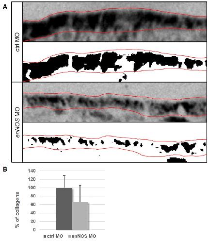 Fig. S2. Collagens changes at protein level Ctrl MO and combination of eNOS and nNOS MO (enNOS MO 2:1) were injected at stage 1. Embryos were fixed in 4% PFA at stage 26 and the sections of embryos were stained by Masson Trichrome staining (A). Epidermis layer was compared and amount of collagens was assessed in control (n = 9) and affected embryos (n = 8). Quantification of amount of collagens (B) Error bars indicate + s.d. and the P-value was < 0.03 At least 5 embryos were used for each condition. |