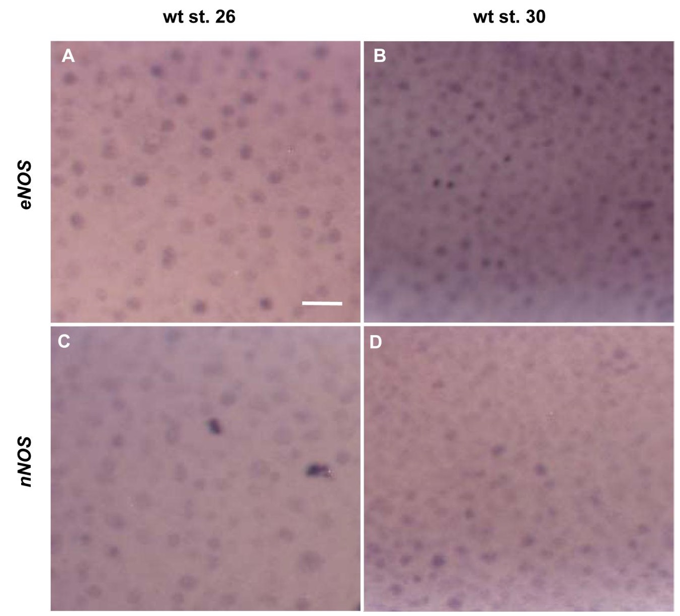 Fig. 2. Occurrence of NOS in embryonic epidermis Embryos were hybridised with probes against eNOS (A,B) and nNOS (B,D) at stage 26 (A,C) and 30 (B,D). Positive cells on eNOS, nNOS are scattered through embryonic epidermis (magnification 11,25x, scale bar = 50 μm). At least 5 embryos were used for each condition. |