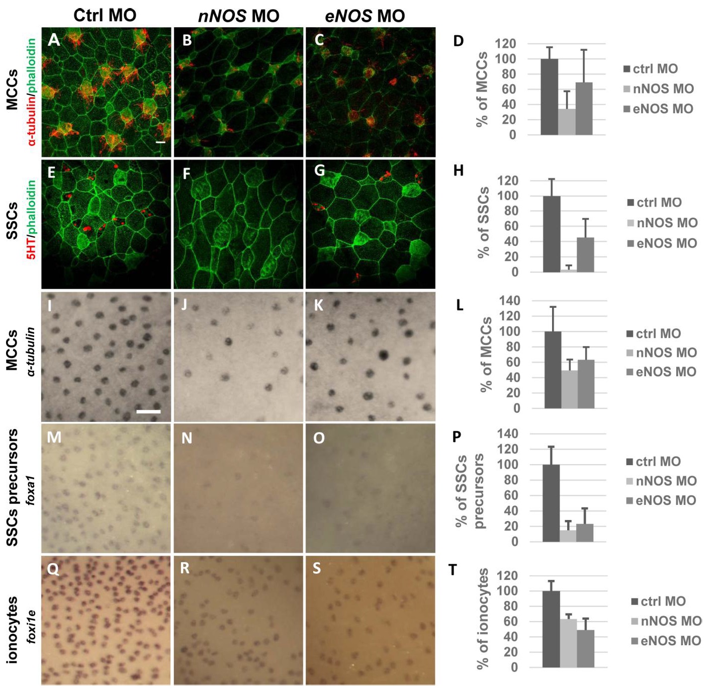 Fig. 3. Inhibition of NO causes defects in ionocytes, multi-ciliated and small secretory cells Embryos were injected by ctrl MO 34 ng (A,E,I,M, Q), nNOS MO 17 ng (B,F,J,N, R) and eNOS MO 34 ng (C,G,K,O,S) at stage 1 and fixed in 4% PFA at stage 26 (I-S), 30 (A-C) and 36 (E-G). MCCs were labeled by anti-alpha tubulin (A-C), vesicles in SSCs were labeled by anti-5HT (E-G) and membranes by antibody against phalloidin (A-G) and imaged (apical surface of the embryonic epidermis) by confocal microscopy (magnification 40x, scale bar = 20 μm) (A-G). MCCs, SSCs and ionocytes were marked by alpha-tubulin (I-K) foxa1 (M-O) and foxi1e probe (Q-S) and imaged by macroscope (magnification 11,25x, scale bar = 50 μm) (I-S). Embryos showing frequency of individual cell types after applying ctrl (A,E,I,M,Q), nNOS (B,F,J,N,R) and eNOS (C,G,K,O,S) MO. Injection of nNOS MOS (B,F,J,N,R) and eNOS MO (C,G,K,O,S) cause reduction in number of MCCs (D), SSCs (H) and reduced expression of scattered cell markers alpha-tubulin (L) foxa1 (P) and foxi1e (T). Quantification of incidence of MCCs (D,L), SSCs (H,P) and ionocytes (T), error bars indicate + s.d., the P value was < 0.005 except ctrl x eNOS (D) where was P value > 0.005. At least 5 embryos were used for each condition (One-way ANOVA, Tukey´s multiple comparisons test). |