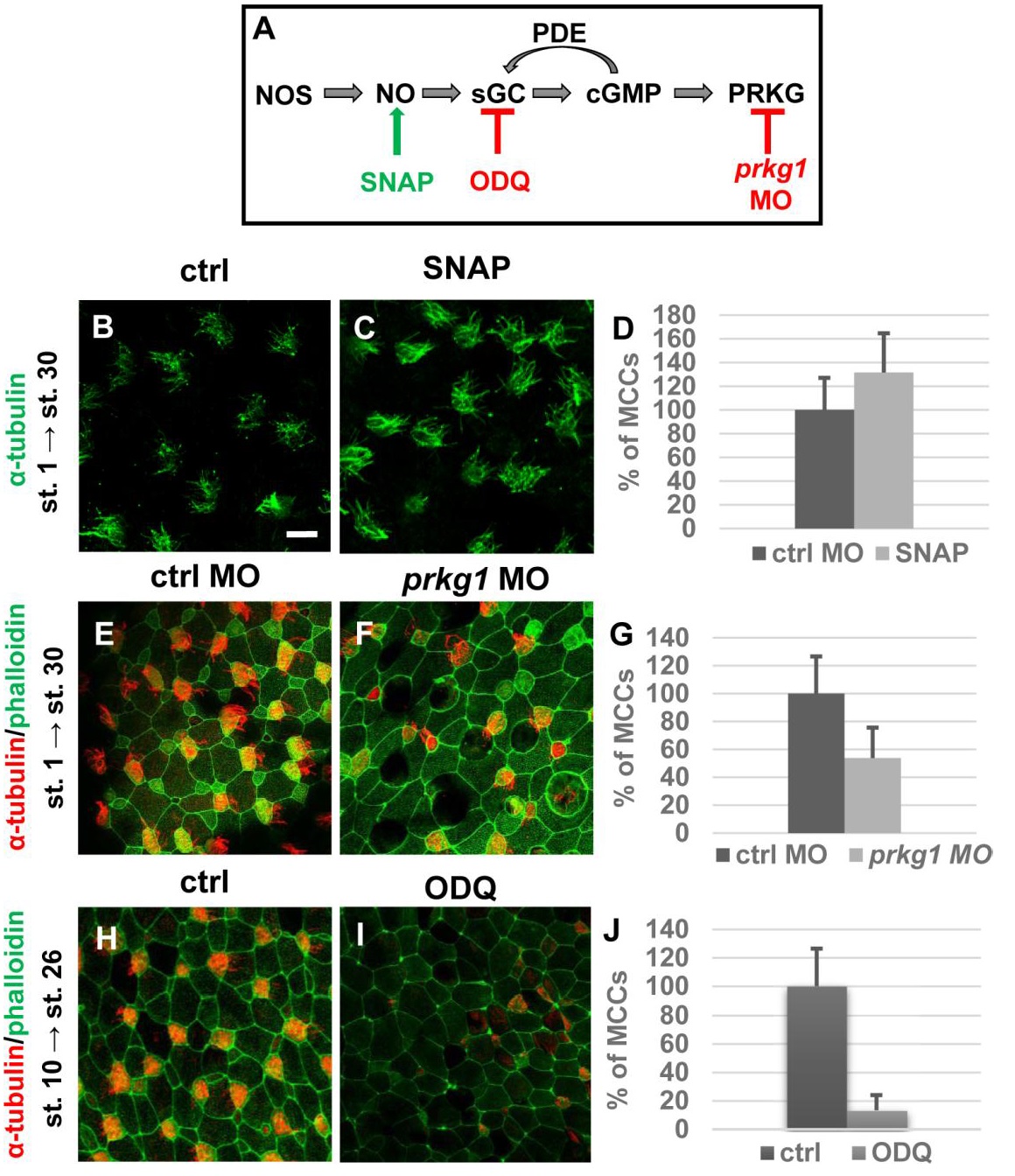 Fig. 4. NO/cGMP signalling pathway and its effect on embryonic epidermis Embryos were injected by ctrl MO 51 ng (E), SNAP 1 nl 100 mM (C), DMSO 1nl 100 mM (B) and prkg1 MO 51 ng (F) at stage 1 and fixed in 4% PFA at stage 30 (B,C,E,F). Embryos were stained with an antibody against α-tubulin (MCCs) and phalloidin (membranes) and imaged (apical surface of the embryonic epidermis) by confocal microscopy (magnification 40x, scale bar = 20 μm). Injection of SNAP increased number of MCCs and prkg1 MO reduced number of MCCs in embryonic epidermis. Quantification of incidence of MCCs (D,G), error bars indicate + s.d., the P-value was < 0,04 (D) and < 0,002 (G). At least 5 embryos were used for each condition (Student´s t test). The vitelline membrane was removed from embryos at stage 8 to 9. Treatment by ODQ were performed at stage 10 to 26 and embryos â affected (I) and control (H) were collected at stage 26. Embryos were stained with an antibody against α-tubulin (MCCs) and phalloidin (membranes) and imaged (apical surface of the embryonic epidermis) by confocal microscopy (magnification 40x, scale bar = 20 μm) Treatment by ODQ reduced number of ciliated cells in embryos at stage 26. Quantification of incidence of MCCs (J), error bars indicate + s.d., the P-value was < 1*10^-8. The scheme shows the NO pathway with used inhibitors in this experiment (A). At least 5 embryos were used for each condition (Student´s t test). |
