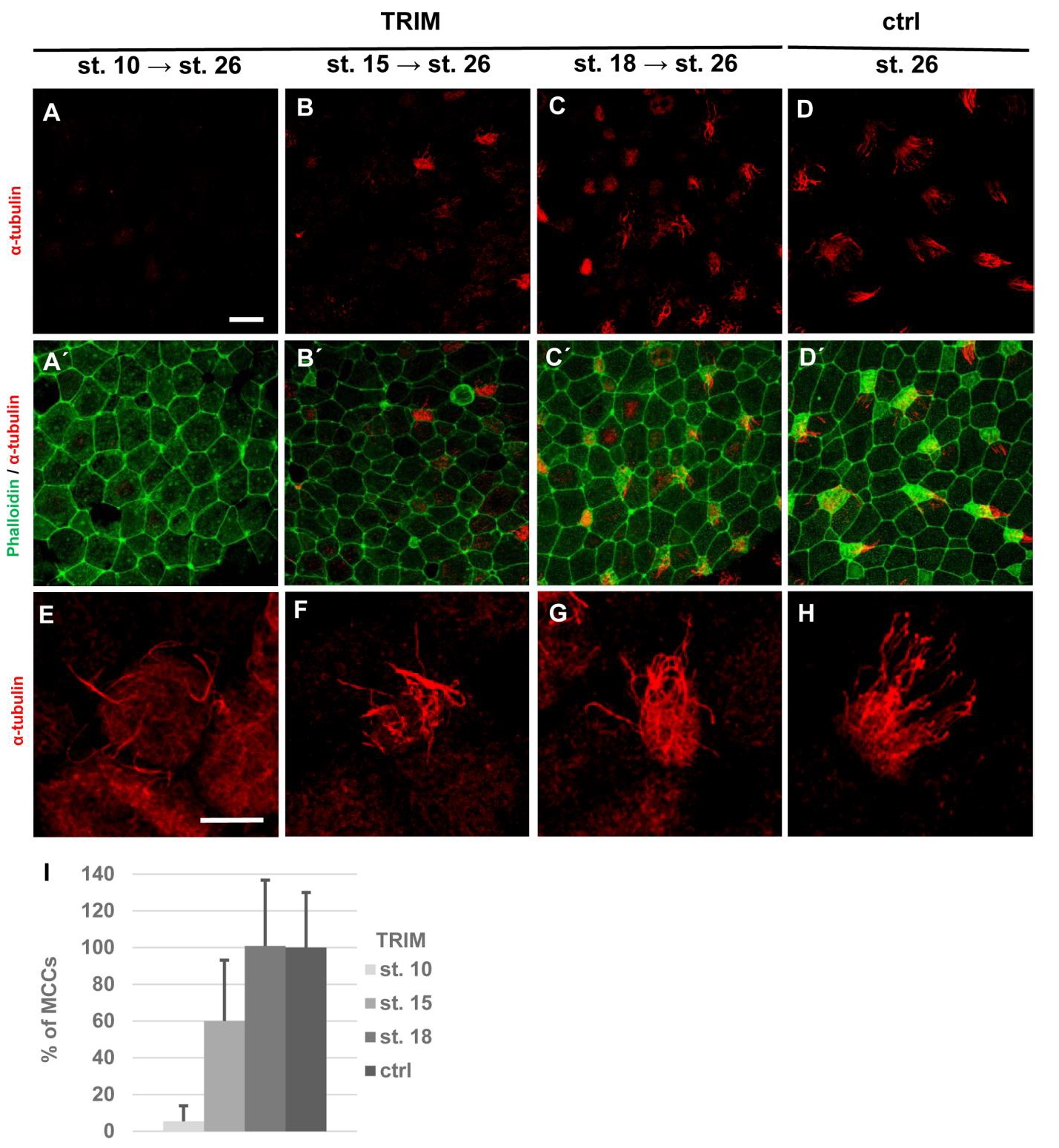 Fig. 5. Determination of developmental stages for necessity of NO The vitelline membrane was removed from embryos at stage 8 to 9. Treatment by TRIM were performed at stage 10 (A,A´,E), 15 (B,B´,F) and 18 (C,C´,G) and all embryos - treated and control (D, D´, H) were collected at stage 26. Embryos were stained with an antibody against α-tubulin (MCCs) and phalloidin (membranes) and imaged (apical surface of the embryonic epidermis) by confocal microscopy (magnification 40x, scale bar = 20 μm). Treatment by TRIM reduced number of MCCs in embryos treated at stage 10 and 15 (A-B). Quantification of incidence of MCCs (I) error bars indicate + s.d., the P-value was < 0.03 (ctrl x st. 10, ctrl x st. 15), no statistically significant difference between ctrl embryos and embryos treated by TRIM at stage 18 (CD). At least 5 embryos were used for each condition (One-way ANOVA, Tukey´s multiple comparisons test). |