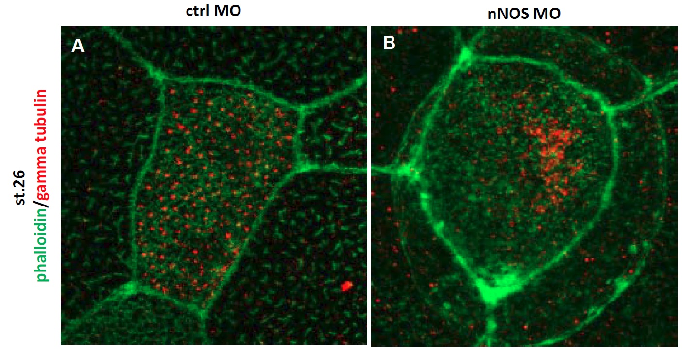 Fig. S5. Inhibition of NO causes acummulation of basal bodies in central region of MCCs. Ctrl MO (A) and nNOS MO (B) were injected into oocyte and fixed in 4% PFA at stage 26. Basal bodies were labeled by gamma tubulin and membranes by antibody against phalloidin and imaged (apical surface of the embryonic epidermis) by confocal microscopy (magnification 63x, scale bar = 20 μm) (A,B). Accumulation of basal bodies in central region of MCCs appears in 50% of embryos with strong phenotype. At least 5 embryos were used for each condition. |
