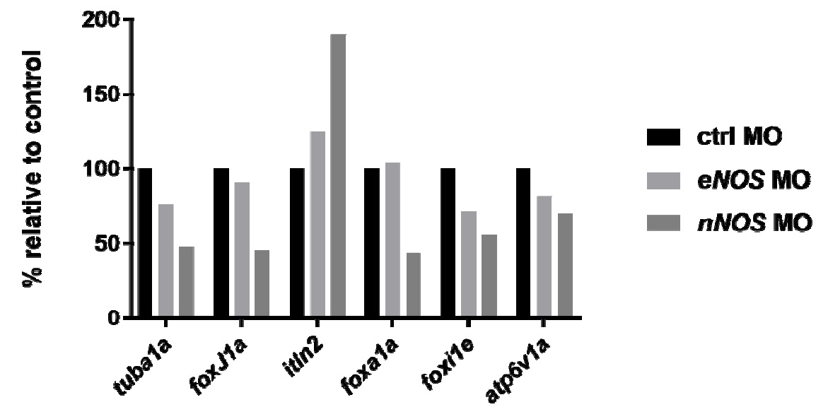 Fig. S6. Gene expression changes in embryonic epidermis with inhibited NO production relative to control (100%) Ctrl MO, nNOS MO and eNOS MO were injected into oocyte and the epidermis samples were manually collected at stage 26. Markers for MCCs (tuba1a, foxJ1a), SSCs (foxa1a) and ionocytes (foxi1e, atp6v1a) were decresed in embryos with inhibited NO production. Marker for goblet cells (itln2) was increased. |