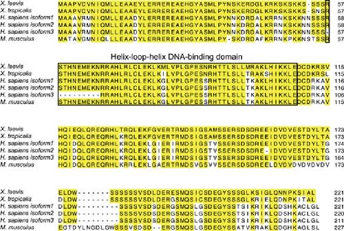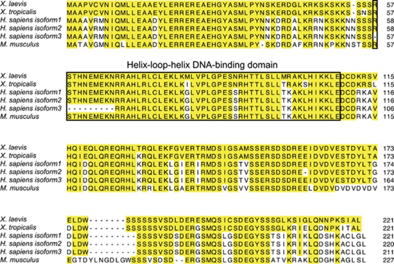 Figure 1. Mad1 is highly conserved in vertebrates. Amino-acid sequence alignment of X. laevis (NP_001090200), X. tropicalis (NP_001072228), H. sapiens (NP_002348, NP_001189442, NP_001189443) and M. musculus (NP_034881) Mad1. The shared amino acids are indicated with yellow boxes. The highly conserved HLH DNA-binding domain of Mad1 is boxed