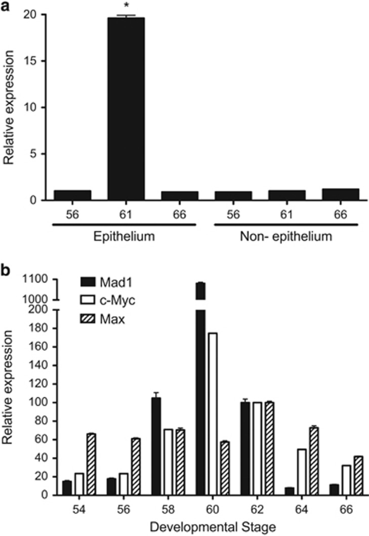 Figure 2. Mad1 is strongly upregulated specifically in the epithelium of the intestine at the climax of metamorphosis when epithelial apoptosis and adult stem cell development take place. (a) The expression of Mad1 was analyzed by RT-PCR on total RNA from the isolated epithelium and non-epithelium (the rest of the intestine) of X. laevis tadpoles at indicated stages during development. (b) Both Mad1 and c-Myc are upregulated, whereas Max expression changes little during intestinal remodeling. The expression of Mad1, c-Myc, and Max was analyzed by RT-PCR on total RNA isolated from whole intestine of X. laevis tadpoles at indicated stages during development. The mRNA level for Mad1, c-Myc and Max was normalized against that of EF1α RNA. The data are shown in arbitrary unit as the mean±S.E. (n=3). The statistical significance was determined by one-way ANOVA followed by Tukey’s multiple comparison test (*P<0.05)