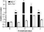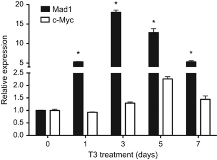 Figure 3. T3 induces Mad1 expression in the intestine, before high levels of c-Myc expression. RT-PCR analysis of Mad1 and c-Myc expression was performed by using total RNA isolated from the intestine of X. laevis stage 54 tadpoles treated with 10 nM T3 for indicated numbers of days. The mRNA level for Mad1 and c-Myc gene was normalized against that of EF1α mRNA. The data are shown as the mean±S.E. (n=3). The statistical significance was determined by one-way ANOVA followed by Tukey’s multiple comparison test (*P<0.05)