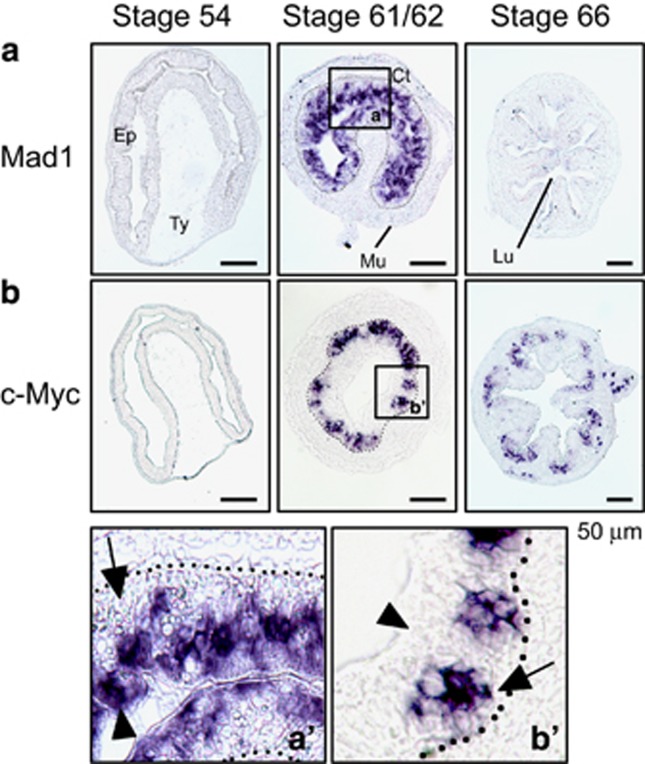 Figure 4. In situ hybridization analysis indicates that Mad1 is expressed in the epithelial cells at the climax of intestinal remodeling. Cross-sections of X. laevis intestine at premetamorphic stage 54, metamorphic climax stages 61/62 and the end of metamorphosis (stage 66) were hybridized with Mad1 (a) and c-Myc (b) antisense probe. The boxed region in a and b at stage 61/62 were enlarged and shown in (a′ and b′), respectively, at the bottom. Note that Mad1 expression was limited to dying larval epithelial cells facing the intestinal lumen in the epithelium at the climax of metamorphosis, consistent with the expression data in Figure 2. The expression of c-Myc was also high at the climax of metamorphosis but was in the epithelial layer close to the connective tissue. Arrows point to clusters of cells or islets in the epithelium close to the connective interface and expressing c-Myc, whereas arrowheads point to the epithelial cells facing the lumen, expressing Mad1. The approximate epithelium–mesenchyme boundary was drawn based on morphological differences between epithelial cells and mesenchyme cells in the photographs, under enhanced contrast and/or brightness by using Photoshop, if needed (dotted lines). Scale bar, 50 μm. CT, connective tissue; Ep, epithelium; Mu, muscle; Lu, lumen; Ty, typhlosole