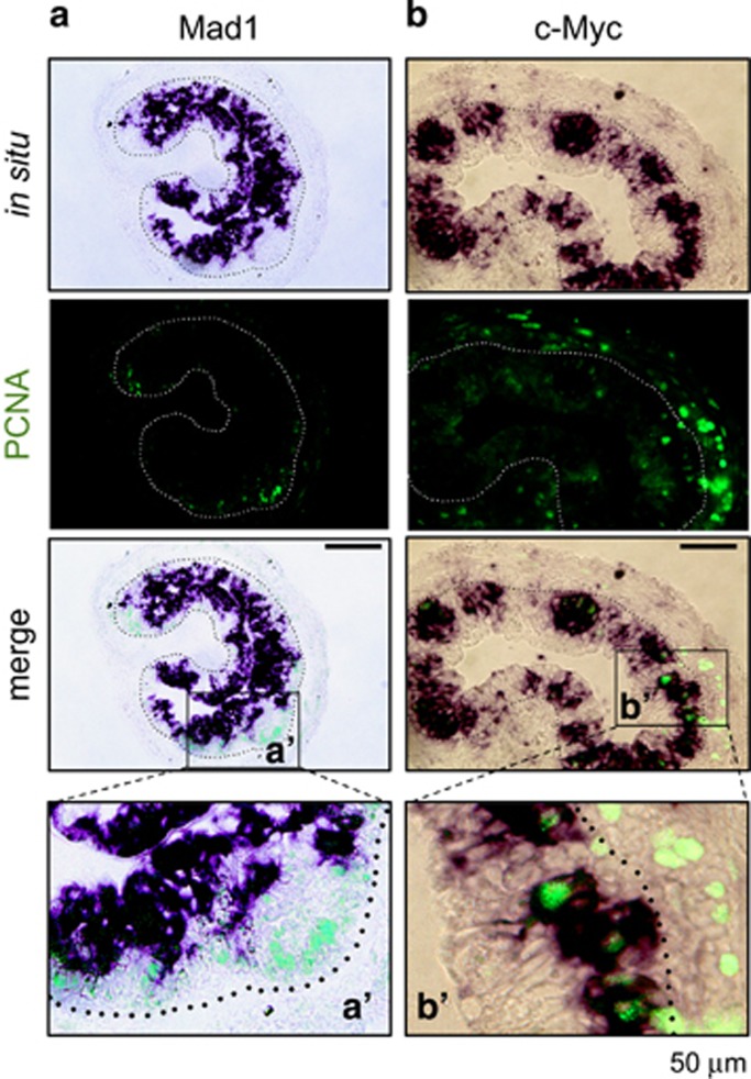 Figure 5. High levels of Mad1 mRNA are expressed in apoptotic but not proliferating epithelial cells. Double staining of PCNA immunohistochemistry (green: cell proliferation) and Mad1 (a) or c-Myc (b) in situ hybridization (purple) was performed on cross-sections of X. laevis intestine at metamorphic climax stage 61/62. Note that Mad1 expression was limited to the epithelial cells facing the lumen, which are known to be dying larval epithelial cells at the climax of metamorphosis.21 These cells did not have PCNA. The PCNA positive, proliferating cells lacked Mad1 mRNA and were localized in between the dying epithelial cells and the connective tissue. In contrast, c-Myc-expressing cells were found to colocalize with the proliferating cells expressing PCNA (b). Higher magnification of boxed areas in the merged panel in (a and b) are shown in a′ and b′, respectively. The approximate epithelium–mesenchyme boundary was drawn based on morphological differences between epithelial cells and mesenchyme cells in the photographs, under enhanced contrast and/or brightness by using Photoshop, if needed (dotted lines). Note that for unknown reason, we observed that the PCNA signals in the connective tissue in (b) were much stronger than in (a). It is possible that it was in part because of weaker staining in (a) and in part that the section in (b) happened to have more proliferating cells. Nonetheless, the colocalization of PCNA with c-Myc but not Mad1 was consistently observed in different intestinal sections. Scale bar, 50 μm