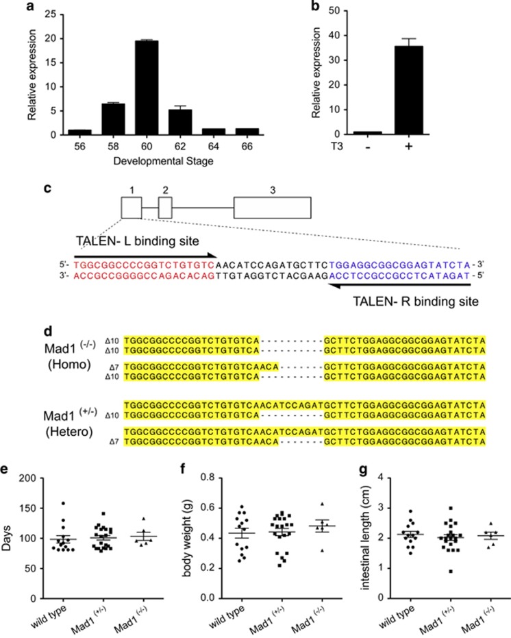 Figure 6. Mad1 knockout tadpoles have no growth defects. (a) X. tropicalis Mad1 is similarly upregulated during intestinal metamorphosis as in X. laevis. The expression of Mad1 was determined by RT-PCR analysis of total RNA isolated from whole intestine of X. tropicalis tadpoles at indicated stages during development. Mad1 mRNA level was normalized against that of EF1α mRNA. The statistical significance was determined by one-way ANOVA followed by Tukeyâs multiple comparison test (*P<0.05). (b) T3 induces Mad1 expression in X. tropicalis premetamorphic tadpoleintestine. Stage 54 X. tropicalis tadpoles were treated with or without 10ânM T3 for 2 days. Total RNA was isolated from the intestine and analyzed by RT-PCR for Mad1 expression. Mad1 mRNA level was normalized against that of EF1α mRNA. The data are shown as the mean±S.E. (n=3). The statistical significance of differences was determined by Studentâs t-test (*P<0.05). (c) Mad1 genomic structure and target sequences of the TALEN against X. tropicalis Mad1 locus. There are three exons in X. tropicalis Mad1 and Mad1-specific TALEN left (L) and right (R) arms were generated to target exon 1. The left and right TALEN-binding sequences are shown in red and blue, respectively, and the spacer region is in black. (d) Sequence of homozygous (Î10/Î10, Î10/Î7) and heterozygous (+/Î10, +/Î7) tadpoles found in F2 generation tadpoles. Deletions are indicated by dashes. (e-g) No gross defect because of Mad1 knockout is found in animals at the end of metamorphosis. Tadpoles were reared identically to stage 66 and then genotyped. The time to reach stage 66 (e), the body weight (f) and intestinal length (g) at stage 66 for each animal was determined and plotted with the mean, marked as a line, and standard error. Note that no significant difference was observed for any of the parameters