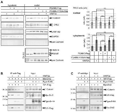 Fig. 8. PGAM5-mediated dephosphorylation inhibits nuclear function of DVL2. (A) Endogenous β-Catenin and DVL2 were detected in the cytoplasmic and nuclear fractions from WNT3A stimulated HEK293T cells transfected as indicated. GAPDH, LAMIN-B and pan-Cadherin were used as markers for cytoplasm, nuclei and membrane fractions, respectively. The ratio between the hyperphosphorylated band (a) and the faster migrating band (b) of DVL2 in nuclear and cytoplasmic fractions are plotted in the graph (data are average±s.d. from at least three independent experiments; *P<0.05; n.s., not significant; separate variances t-test). (B) In whole-cell lysates of HEK293T cells, Xenopus Tcf1-Flag co-precipitated with overexpressed Myc-Dvl2 and endogenous β-Catenin irrespective of WNT3A stimulation. Co-expression of Pgam5-HA strongly reduced interaction between Tcf1-Flag, Myc-Dvl2 and endogenous β-Catenin; WNT3A stimulation moderately enhanced interaction of Tcf1 with Dvl2, but not β-Catenin in the presence of exogenous Pgam5. (C) In the inverse co-immunoprecipitation experiment Myc-Dvl2 was immunoprecipitated. The WNT3A-induced interaction of Tcf1-Flag with Myc-Dvl2 was blocked by co-expression of Pgam5. |