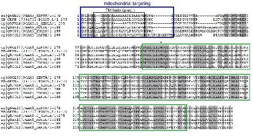 Supplementary Figure 1 Alignment of Xenopus tropicalis Pgam5, Xenopus laevis Pgam5.S and Pgam5.L to the zebrafish, human and mouse orthologs (Uniprot Accession Numbers X. tropicalis Pgam5 Q6GL33, X. laevis Pgam5.S Q5FWM4, X. laevis Pgam5 was translated from XB-GENE-17344731, D. rerio Pgam5 Q502L2, H. sapiens PGAM5 Q96HS1, M. musculus Pgam5 Q8BX10). Identical amino acids are shaded grey. The boxes mark functional features: blue – mitochondrial targeting sequence (Lo and Hannink, 2008), black: predicted transmembrane helix, green – PGAM domain. Histidine 105 (human numbering) in the catalytic center is labeled with an asterisk. |