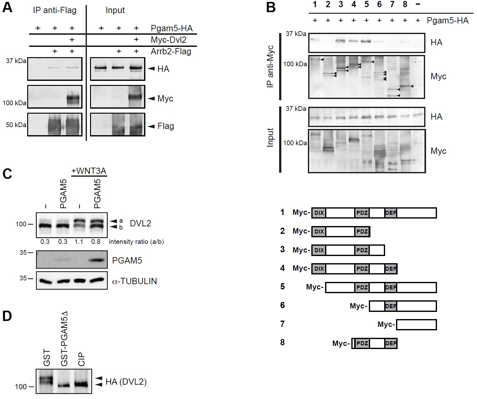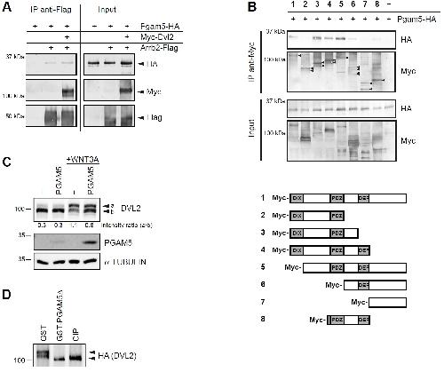 Supplementary Figure 2 (A) Co-immunoprecipitation of overexpressed proteins shows a weak interaction of Pgam5 with Arrb2, which is slightly increased by co-expression of Dvl2. (B) Western blot corresponding to Fig. 1D. The binding site of Pgam5 to Dvl2 was mapped to the region interspacing the PDZ and DEP domain of Dvl2 by co-immunoprecipitation of Pgam5-HA with a series of truncated Dvl2-Myc constructs (1-8) as illustrated. (C) Overexpression of PGAM5 partially reverted WNT3A niduced electrophoretic mobility shifts of endogenous DVL2 in HEK 293T cells, indicating that PGAM5 dephosphorylates DVL2. (D) HA-DVL2 was immunoprecipitated, washed with high stringency to remove bound proteins and incubated with recombinant GST, GST-PGAM5δ (lacking the N-terminal mitochondrial targeting sequence) or Calf Intestinal Alkaline Phosphatase (CIP) for 30 min at 37°C. The sample incubated with GST showed two bands. After incubation with GST-PGAM5δ or CIP only one band with higher electrophoretic mobility remained, which confirmed that DVL2 is directly dephosphorylated by PGAM5. |
