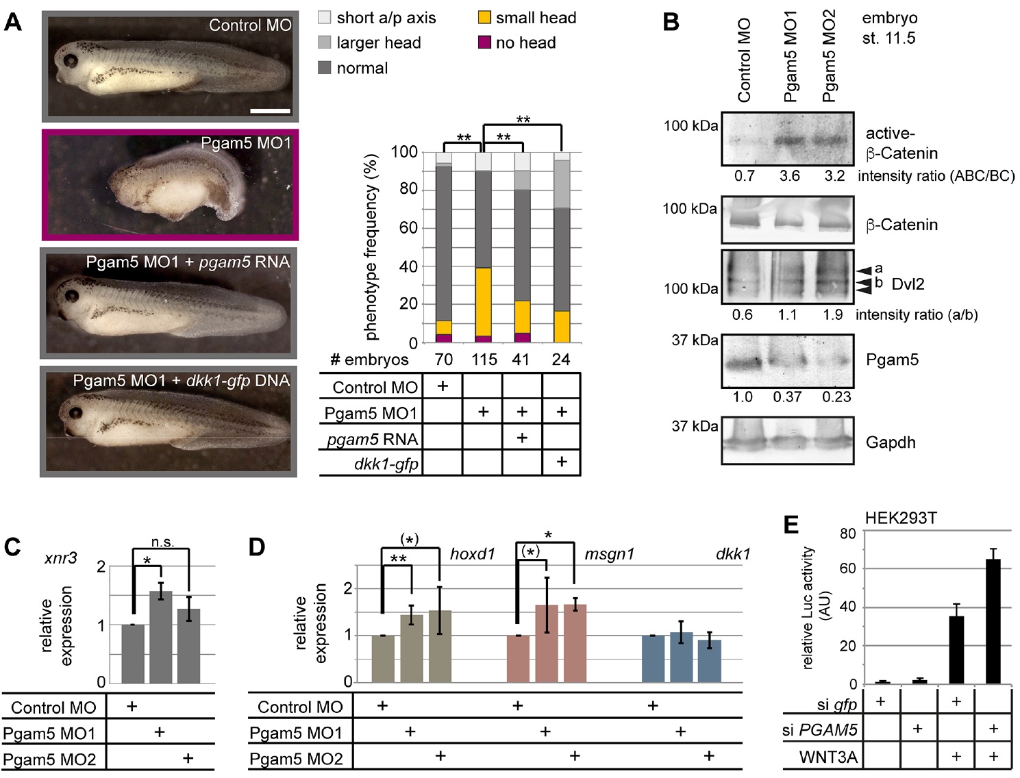 Fig. 4. Pgam5 modulates Wnt/β-Catenin signaling in Xenopus laevis. Embryos were injected with 0.4 pmol Pgam5 MO1 or control MO in both blastomeres at the two-cell stage. (A) The Pgam5 MO1 phenotypes are rescued by co-injection of either 100 pg MO-insensitve Xenopus pgam5 RNA or 10 pg dkk1-gfp DNA, as indicated. Scale bar: 500 μm. The frequencies of the indicated phenotypes from at least three independent experiments with the indicated total numbers of embryos are summarized in the graph (**P<0.01, Ï2-test). (B) Pgam5 depletion resulted in overall elevated levels of active dephosphorylated β-Catenin (ABC) and hyperphosphorylation of Dvl2 in NF stage 11.5 embryos. Band intensities of ABC, β-Catenin (BC), hyperphosphorylated and dephosphorylated Dvl2 (a and b, respectively) have been quantified and the intensity ratios for ABC/BC and Dvl2 a/b are given below the respective blots. Pgam5 knockdown resulted in upregulation of endogenous Wnt/β-Catenin target genes. (C,D) Relative expression of the indicated genes from four independent experiments (data are average ±s.d.). Statistically significant deviations are indicated by asterisks [**P<0.01, *P<0.05, (*)P<0.1, t-test for the hypothesis of the mean]. (E) Knockdown of PGAM5 also strongly enhanced responsiveness of HEK 293T cells to WNT3A stimulation, as determined by TOP-Flash reporter gene assays. |