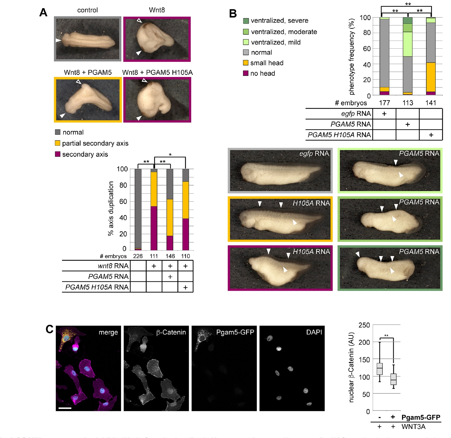 Fig. 6. PGAM5 overexpression inhibits Wnt/β-Catenin signaling in Xenopus embryos and human cells. (A) Secondary body axes were induced in Xenopus laevis embryos by injection of 5 pg wnt8 RNA and 100 pg PGAM5 or PGAM5-H105A RNAwere co-injected as indicated into both ventral blastomeres at the fourcell stage. Images show representative examples of embryos; filled arrowheads indicate primary axes, open arrowheads indicate secondary axes. The graph shows the frequency of complete and partial axis duplication from five independent experiments. (B) Phenotypes of embryos injected with 200 pg egfp, PGAM5 RNA or PGAM5-H105A RNA (H105A RNA) in both blastomeres at the two-cell stage. Arrowheads indicate the dorsal fin and somites. The frequencies of the indicated phenotypes from at least three independent experiments are summarized in the graph. The statistical significance of deviations in A and B was calculated using theWilcoxon Rank Sum test; **P<0.01, *P<0.05. (C) Pgam5 overexpression reduced nuclear β-Catenin levels in Xenopus embryonic fibroblasts (XTC cells). Cells were transfected as indicated, stimulated with WNT3A-conditioned medium for 1 h and immunostained for endogenous β-Catenin. Scale bar: 50 μm. The graph summarizes nuclear β-Catenin intensity of at least 20 GFP-positive and GFP-negative cells (**P<0.01, separate variance t-test). |