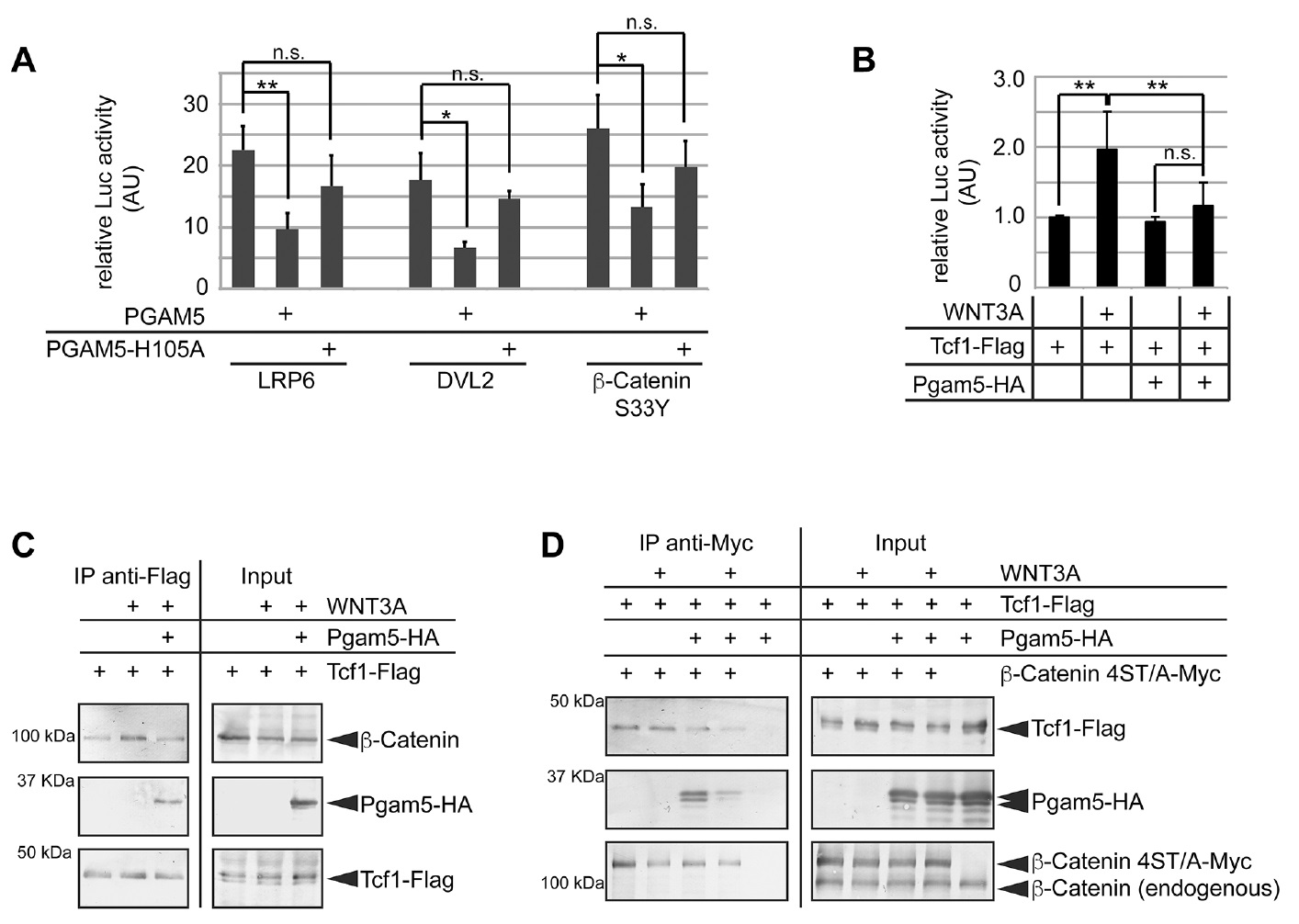 Fig. 7. PGAM5 interferes with Wnt/β-Catenin signaling downstream of β-Catenin stabilization. (A) PGAM5, but not PGAM5-H105A, antagonized TOPFlash activation by LRP6, DVL2 and stabilized β-Catenin. (B) Xenopus Pgam5 blocked stimulation of the TOP-Flash reporter by WNT3A in the presence of exogenous Tcf1. Normalized average Luciferase activity±s.d. from at least three independent experiments are shown in A and B (**P<0.01, *P<0.05, n.s. not significant, separate variances t-test). (C) WNT3A stimulation enhanced interaction of Tcf1-Flag with endogenous β-Catenin in HEK 293T cells, which was attenuated by co-expression of Pgam5-HA. (D) Tcf1-Flag co-precipitated with stabilized β-Catenin 4ST/A-Myc irrespective of WNT3A stimulation. Co-expression of Pgam5-HA strongly reduced interaction between Tcf1-Flag and β-Catenin 4ST/A-Myc. |