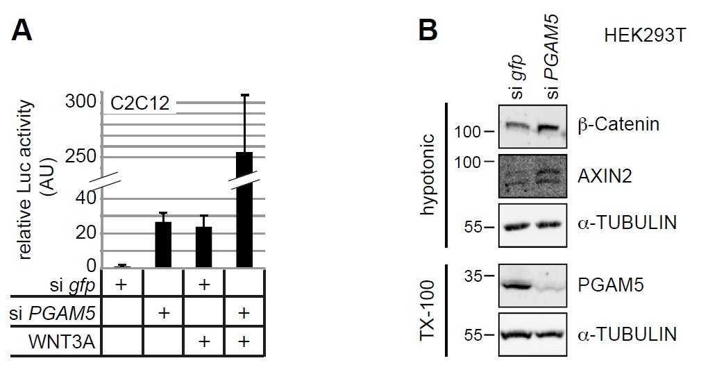 Supplementary Figure 6 (A) Knock-down of PGAM5 by siRNA transfection strongly enhanced responsiveness of murine C2C12 cells to WNT3A stimulation as determined by TOP-Flash reporter gene assays normalized to β-Galactosidase. (B) PGAM5 knock-down in HEK293T cells resulted in stabilization of cytoplasmic β-Catenin and upregulation of the feedback target AXIN2. |
