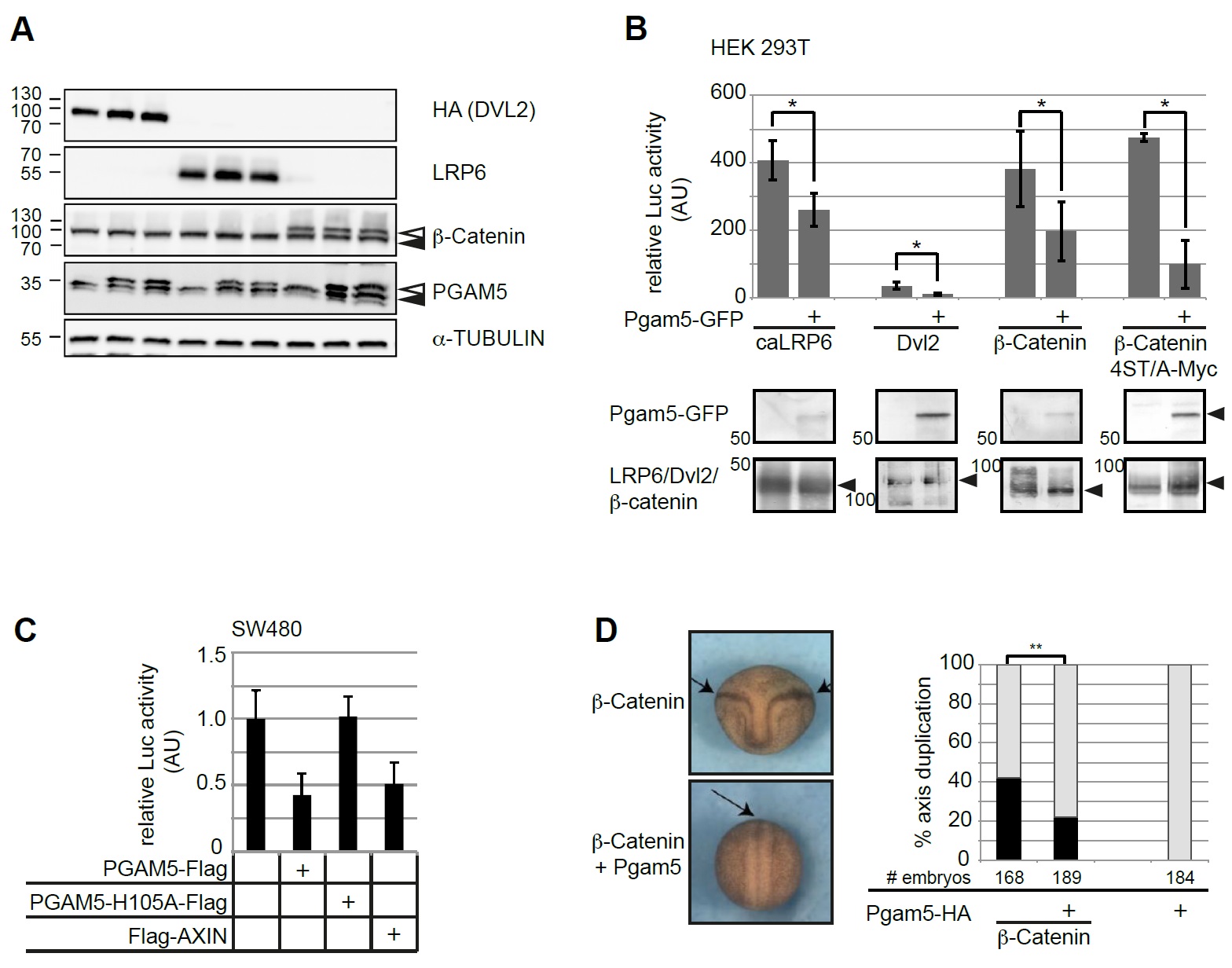 Supplementary Figure 7 (A) Expression of overexpressed proteins corresponding to Figure 7A was confirmed by Western Blot. Filled arrowheads indicate endogenous proteins, open arrowheads indicate overexpressed proteins. (B) Xenopus Pgam5 antagonized TOP-Flash activation by constitutively-active LRP6, Dvl2, β-Catenin or stabilized β-Catenin 4ST/A-Myc. The graph shows average ± SD from at least three independent experiments. Statistical significance of deviations was calculated using the t-test for the hypothesis of the mean (* p-value < 0.05). Expression of overexpressed proteins was confirmed by Western Blot; corresponding blots are provided below the respective columns. (C) Overexpression of PGAM5 in SW480 colon carcinoma cells suppressed constitutive Wnt/β-Catenin activity; the phosphatase-inactive mutant PGAM5-H105A had no effect. Overexpression of AXIN downregulated TOP-Flash activity comparable to PGAM5. TOP-Flash values were normalized to β-Galactosidase. (D) Secondary body axes were induced in Xenopus laevis embryos by injection of 400 pg β-catenin RNA and 100 pg pgam5 RNA was co-injected as indicated into both ventral blastomeres at the four-cell stage. The graph shows the frequency of axis duplication from four independent experiments; statistical significance of deviations was calculated using the Ï2-test; ** p-value < 0.01. Images show representative examples of embryos; arrows indicate neural tubes in the primary and â if present â in the secondary axis. |