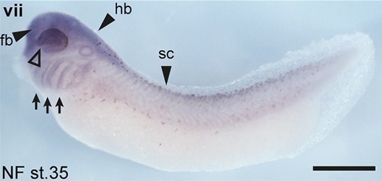 pgam5 (PGAM family member 5, serine/threonine protein phosphatase, mitochondrial) gene expression in Xenopus laevis embryo, assayed via in situ hybridization, NF stage 35, lateral view, anterior left, dorsal up. |