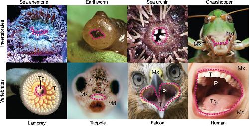 Figure 1. Mouths in adult or larval animals. Frontal views of sea anemone Anthopleura elegantissima, earth worm Lumbricus terrestris, sea urchin Strongylocentrotus purpuratus, grasshopper Anacridium aegyptium, lamprey Petromyzon marinus, tadpole of frog Xenopus laevis, falcon Falco cherrug, and human Homo sapiens. Red dotted line denotes the border of the oral cavity. Md, mandible; Mx, maxilla; P, pharynx; T, teeth; Tg, tongue. |