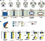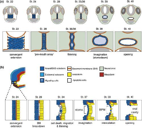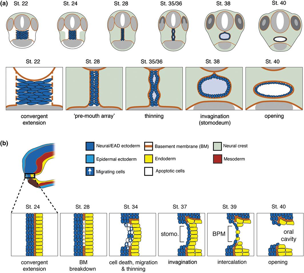 Figure 6. Steps in Xenopus mouth formation. (a) Coronal views of steps to mouth opening. Frontal views of the embryo are shown. The extreme anterior domain (EAD) begins at early tailbud (st. 22) as a wide, short block of cells. By late tailbud (st. 28), the neural crest (NC) migrates to lie on either side of the EAD. Signals from the NC initiate convergent extension in the EAD so that it forms a pre-mouth array. Apico-basal polarity is established in the pre-mouth array, which separates down the midline to form the stomodeum at hatching stages (st. 35/36), that opens into the mouth at tadpole stage (st. 40). NC is in light green. (b) Sagittal views of steps to mouth opening. The EAD from a tailbud embryo showing different germ layers is enlarged in schematics below. Epidermal ectoderm is not shown in enlarged schematics. At late tailbud (st. 28), the pre-mouth array forms by convergent extension, and the basement membrane (BM) between EAD ectoderm and endoderm disintegrates. The pre-mouth array opens to form the stomodeal invagination. Stomodeal ectoderm thins concurrent with a burst of apoptosis and migration of ectoderm out of the region at hatching stages (st. 34â37). Intercalation of ectoderm and endoderm produces the buccopharyngeal membrane (BPM), which perforates to open the mouth at tadpole stages (st. 39â40). |