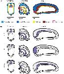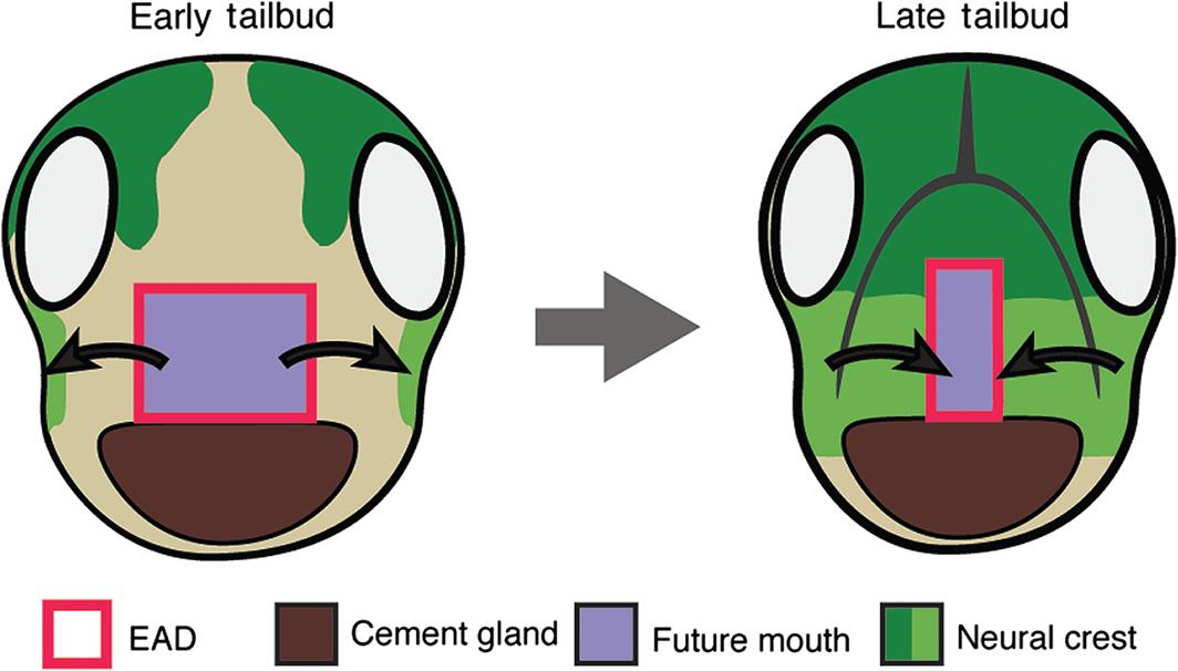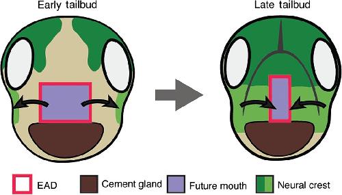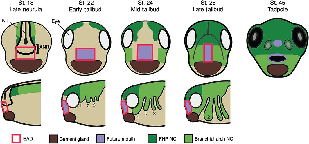 Figure 4. Relationship of the extreme anterior domain (EAD) and neural crest (NC) to the Xenopus mouth. Branchial arch (BA, light green) NC, and frontonasal prominence crest (FNP, dark green) delaminate from the dorsal neural tube (NT) at neurula. The EAD (red outline) is specified including cells arising from the anterior neural ridge (ANR, black outline) and cement gland (CG, brown) tissue. The EAD (purple) will contribute to the lining of the mouth (as well as the nostrils and anterior pituitary). FNP NC migrates anteriorly between the eyes to enter the face while first BA NC migrates bilaterally into the face (late neural-mid tailbud). Subsequent to NC ingress, EAD ectoderm thins and lengthens to become the âpre-mouth arrayâ (early-mid tailbud). NC cells eventually differentiate to form the facial skeleton, including the palate, maxilla, mandible, and connective tissue. |