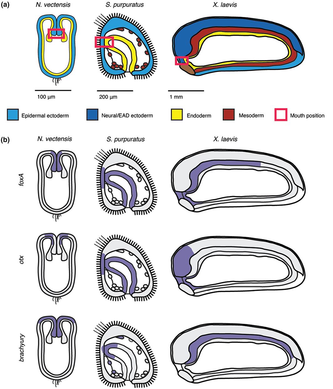 Figure 2. Mouth forms where ectoderm and endoderm are juxtaposed. (a) Position of future mouth relative to germ layers in embryos of three representative animals. Schematics of sagittal sections are shown for the diploblast cnidarian Nematostella vectensis (invertebrate), the triploblasts and deuterostomes sea urchin Strongylocentrotus purpuratus (invertebrate) and frog Xenopus laevis (vertebrate). The red box outlines the mouth-forming region made up of juxtaposed ectoderm and endoderm. In vertebrates, this region is termed the extreme anterior domain. (b) Ancestral mouth embryonic gene expression domains in N. vectensis, S. purpuratus, and X. laevis (purple). The mouth expression domain of foxA and otx but not brachyury is conserved in vertebrates. |