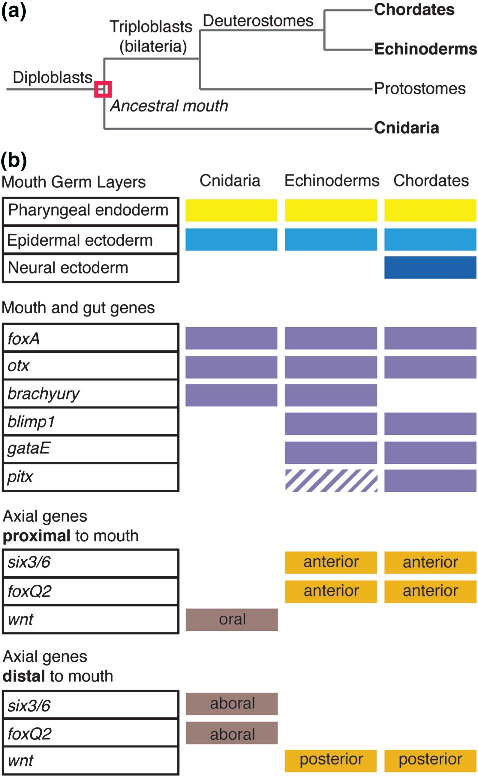 Figure 3. Ancestral mouth was present in the common ancestor of cnidaria and triploblasts. (a) Phylogenetic tree. Chordates, echinoderms, and cnidaria are three distantly related phyla that retain common mouth characteristics, suggesting that the mouth evolved once. (b) Criteria used to evaluate mouth evolution. The mouths of cnidaria, echinoderms, and chordates are all comprised of ectoderm and endoderm and express foxA and otx. There are phylum-specific characteristics such as neural ectoderm contributing to the chordate mouth and the expression of blimp1, gataE , and pitx in echinoderm and chordates. Analysis of axial positioning genes demonstrates that the cnidarian oralâaboral axis is equivalent to the echinoderm and chordate posteriorâanterior axis. |