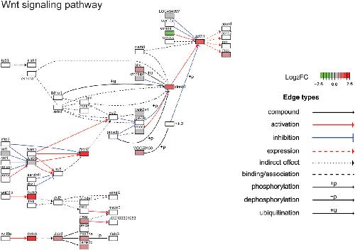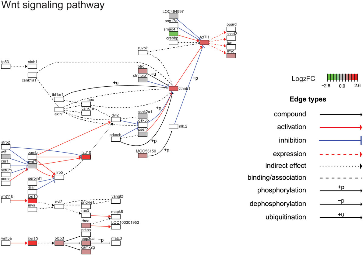 Figure 5. Gene expression changes in the Wnt/β-catenin signaling pathway. Shown is the Kyoto Encyclopedia of Genes and Genomes Wnt/β-catenin signaling pathway with differential gene expression values plotted for genes with false-discovery rate <0.05. The color of each gene represents the direction of regulation (red = positive; gray = no change; green = negative). log2FC = log2 fold change. The intensity of the color is the value relative to the most highly regulated gene (log2FC = 2.6) in the entire dataset. |