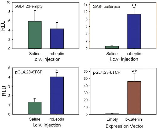 Figure 7. The canonical Wnt/β-catenin signaling pathway is activated by leptin signaling in Xenopus laevis tadpole brain. We injected plasmids into the region of the third ventricle of premetamorphic (NieuwkoopâFaber stage 50) tadpoles and transfected them by biopolar electroporation-mediate gene transfer. Twenty-four hours after transfection, we screened tadpoles for EGFP expression, and then separated them into eight groups. The reporter vector is given at the top left of each panel. Tadpoles received intracerebroventricular (i.c.v.) injections of 0.6% saline or recombinant Xenopus leptin (rxLeptin) (20 ng/g BW); a separate group was cotransfected with the pGL4.23-6TCF reporter vector and either empty expression vector (pCMVneo-empty) or a vector that expresses constitutively active β-catenin (pcDNA3-S33Y β-catenin). Two hours after i.c.v. injection, tadpoles were killed and brains harvested for dual-luciferase assay. Asterisks indicate statistically significant differences (*p < 0.001, **p < 0.0001; n = 8 tadpoles/treatment). |