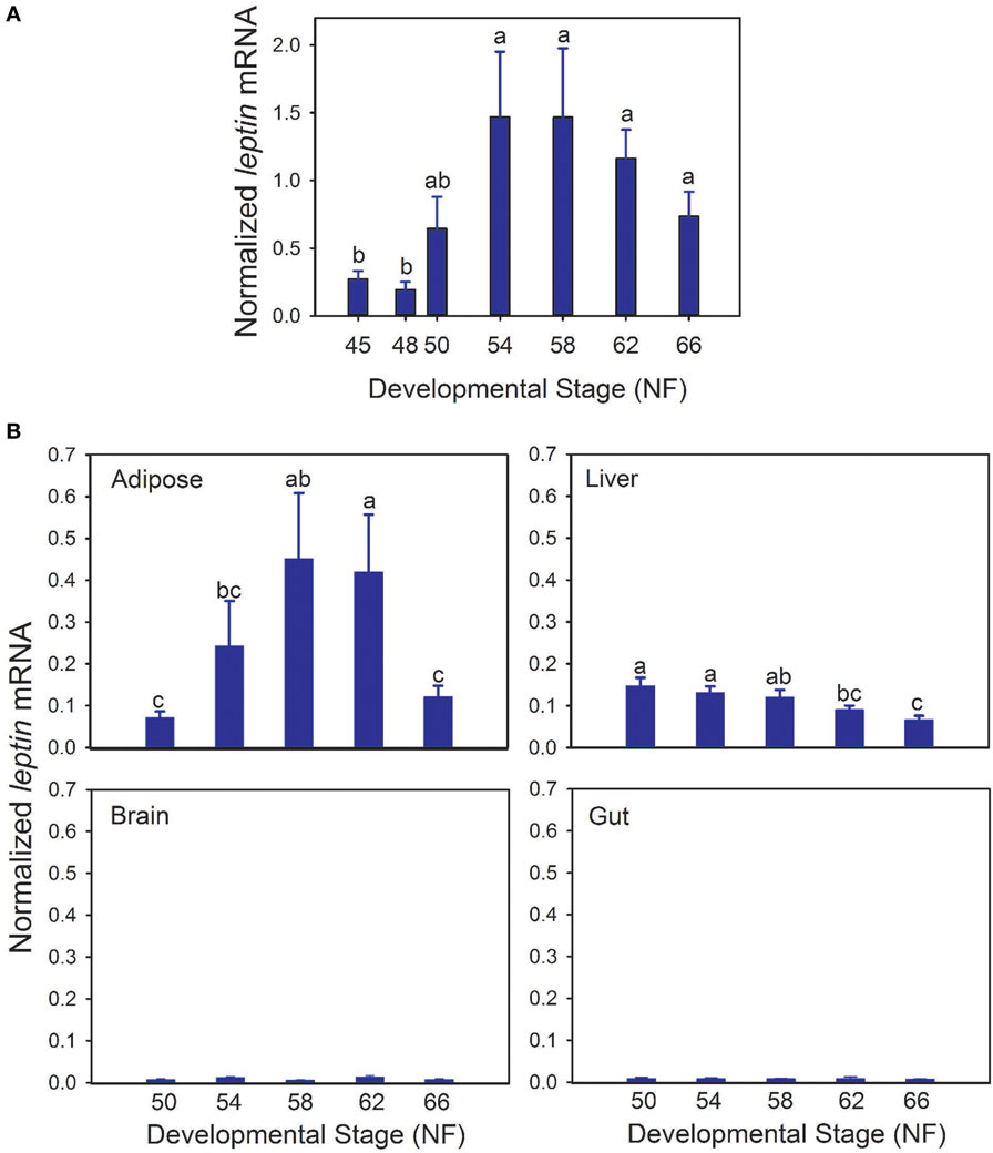 Figure 1. Transcription of the lep gene is activated during tadpole metamorphosis. (A) Whole body lep mRNA increases during tadpole metamorphosis. (B) Developmental changes in lep mRNA in four tadpole tissues during metamorphosis. We analyzed lep mRNA by reverse transcriptase quantitative real-time PCR. Note that the scales of the graphs in panel (B) are not directly comparable to the graph in panel (A) since the samples were analyzed in separate assays using a relative quantification method (see Materials and Methods). Means with the same letter are not significantly different [p < 0.05; Fisherâs least squares difference test; n = 5â6/NieuwkoopâFaber (NF) stage]. |