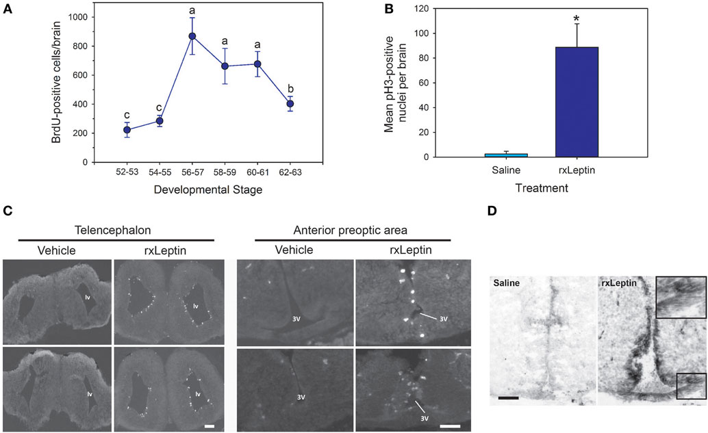 Figure 2. Leptin induces mitosis in premetamorphic tadpole brain. (A) Changes in cell proliferation in tadpole brain throughout metamorphosis analyzed by BrdU incorporation [data are modified from Denver et al. (30); reproduced with permission]. (B) Quantification of pH3 positive cells in tadpole brain following intracerebroventricular injection of saline or recombinant Xenopus leptin (rxLeptin) (200 ng/g BW). Tadpoles were given two injections, the second 24 h after the first, and then they were killed 48 h after the first injection. *Denotes a statistically significant difference (p < 0.05; Studentâs unpaired t-test). (C) Images of transverse sections of the region of the telencephalon [lateral ventricle (lv)] and anterior preoptic area [location of neurosecretory neuron cell bodies; third ventricle (3V)] of tadpole brain stained for pH3. Scale bars = 120 µM. (D) Induction of pSTAT3 immunoreactivity in cells located in the ventricular zone (VZ)/subventricular zone (SVZ) of premetamorphic (NieuwkoopâFaber stage 50) tadpole brain by rxLeptin (20 ng/g BW; 1 h). The inset shows a higher magnification view of the VZ/SVZ with elongated cells undergoing migration out of the neurogenic zone. |