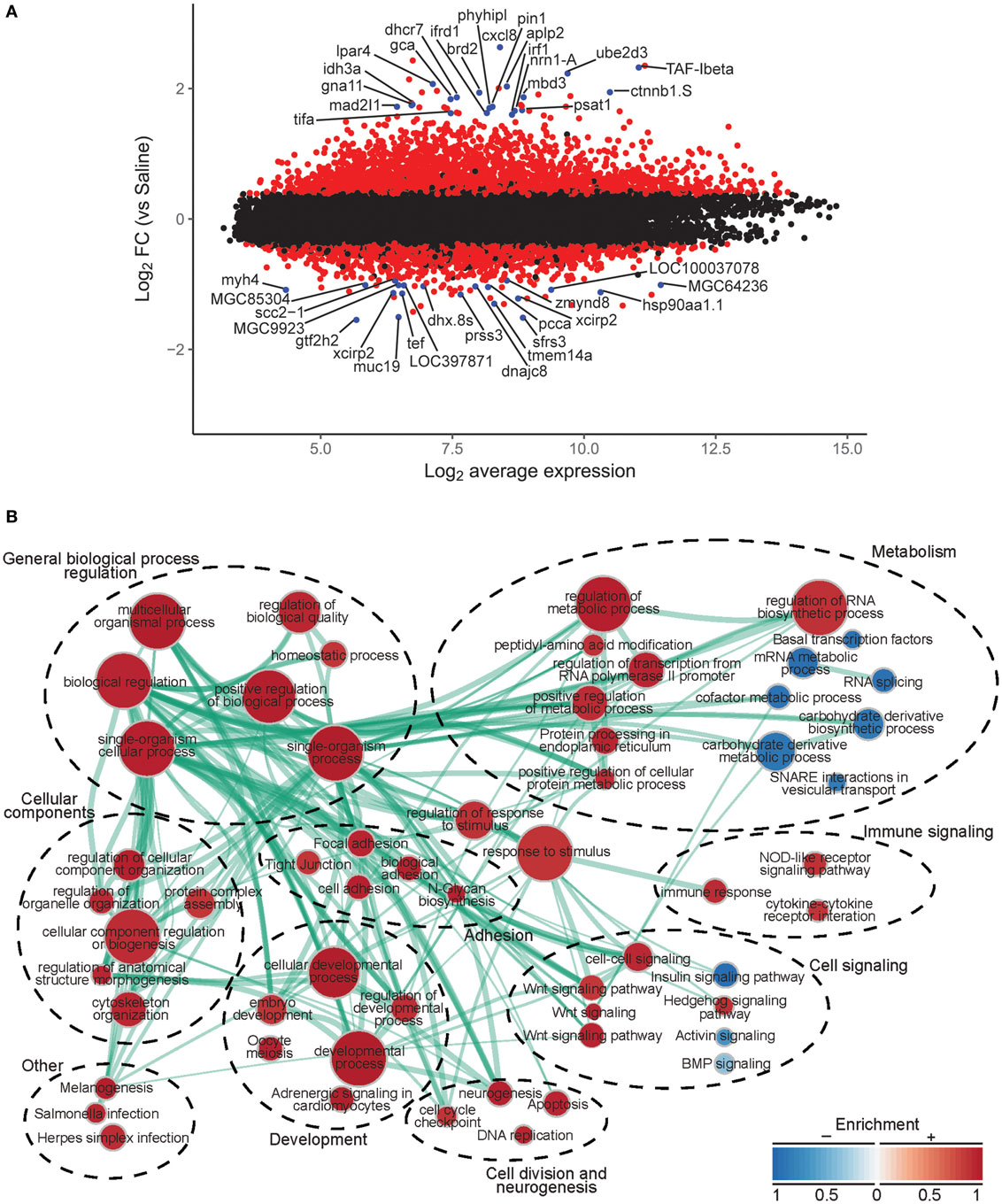 Figure 3. Analysis of microarray data from preoptic area/hypothalamus of saline or recombinant Xenopus leptin (rxLeptin)-injected [intracerebroventricular (i.c.v.) 20 ng/g BW; 2 h] NieuwkoopâFaber stage 54 tadpoles. (A) Transformed log ratio and mean average plot [log2 fold change (log2FC) vs. average expression] of saline vs. rxLeptin-injected tadpole mRNA levels (see Materials and Methods). Dots represent genes: red = genes with a false-discovery rate <0.05; blue = top 20 differentially expressed and annotated Xenopus laevis genes; black = all other genes. (B) Biological processes, pathways, and modules affected by i.c.v. rxLeptin injection. Enrichment map of enriched biological process gene ontology terms (redundancy reduced, p < 0.05), Kyoto Encyclopedia of Genes and Genomes (KEGG) pathways (p < 0.05), and KEGG modules. Circular node color reflects positive (red) or negative (blue) enrichment. Node color intensity reflects the degree of enrichment relative to the most highly enriched in either direction. Lines (green) represent significant genetic information shared between connected nodes (above 50%), and line thickness represents the degree of shared information. |