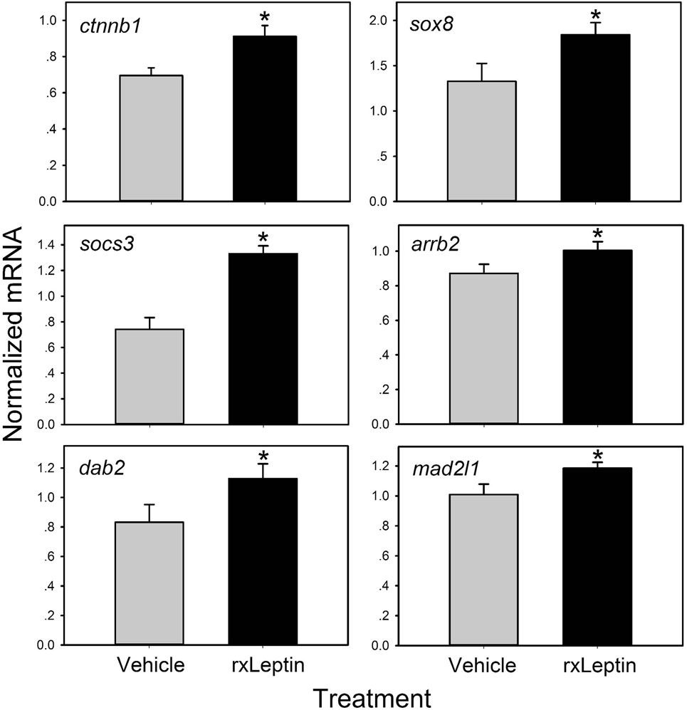 Figure 4. Validation of leptin-induced genes in NieuwkoopâFaber stage 54 Xenopus laevis tadpole preoptic area/hypothalamus by reverse transcriptase quantitative real-time PCR (RTqPCR). Tadpoles received an injection intracerebroventricular of 0.6% saline or recombinant Xenopus leptin (rxLeptin) (20 ng/g BW) and were killed 2 h later for tissue harvest for RNA isolation. Gene expression was analyzed by SYBR Green RTqPCR and normalized to the reference gene rpL8 which was not affected by rxLeptin injection (data not shown). Asterisks indicate statistically significant differences from saline injected controls (*p < 0.05; unpaired Studentâs t-test). |