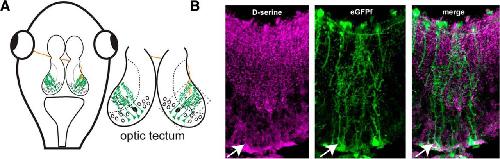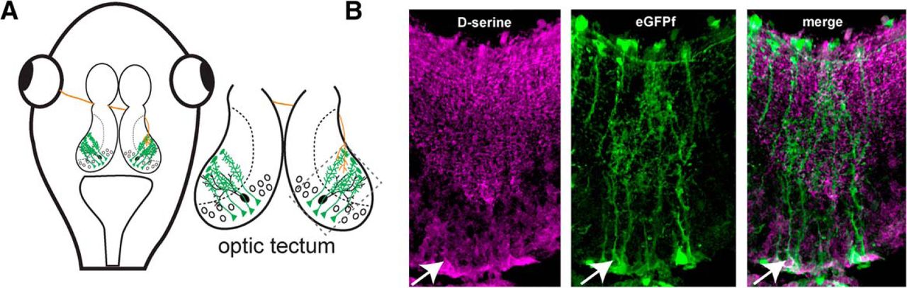 D-Serine is present in radial glial cells in the optic tectum. A, Schematic of the Xenopus tadpole optic tectum showing radial glia cells (green), RGC axons (red), and tectal neurons (black). B, Confocal image of immunohistochemical staining showing that the gliotransmitter d-serine (magenta) colocalizes with farnesylated EGFP (green) expressed in radial glial cell bodies (arrowhead), in their endfeet and in varicosities on glial fine processes throughout the tectal neuropil. Lateral is up. |