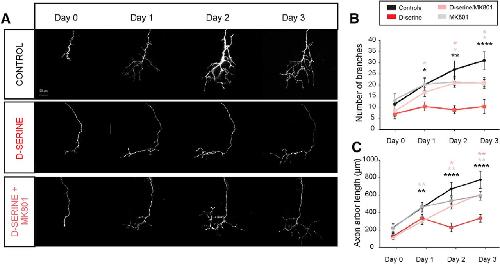 D-Serine results in reduced growth and branching of axonal arbors. Daily in vivo imaging of individual retinotectal axon arbors in animals electroporated to express EGFP in RGCs. Repeated imaging over 3 d of exposure to rearing solution containing d-serine (100 μm) and/or the NMDAR antagonist MK-801 (10 μm). A, Individual examples show greatly reduced growth and branching of d-serine-treated axons, which is rescued by NMDAR blockade. B, Number of branch tips and (C) total axonal arbor length for control tadpoles (n = 7), tadpoles raised in d-serine (n = 6), MK-801 (n = 5), and d-serine + MK-801 (n = 7). *p < 0.05, d-serine-treated versus other groups (two-way repeated-measures ANOVA with HolmâSidak post hoc test). ***p < 0.005, d-serine-treated versus all other groups (two-way repeated-measures ANOVA with HolmâSidak post hoc test). ****p < 0.0001, d-serine-treated versus all other groups (two-way repeated-measures ANOVA with HolmâSidak post hoc test). Black asterisk versus control. Gray asterisk versus MK-801. Pink asterisk versus d-serine + MK-801. |