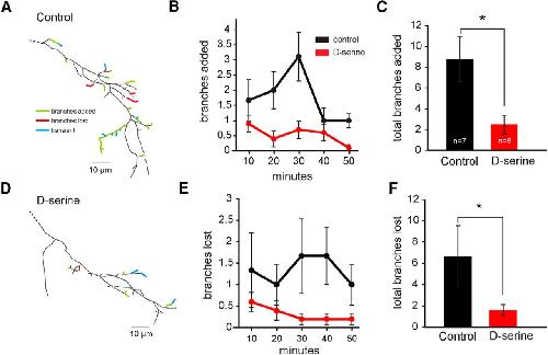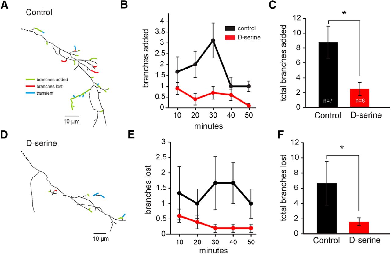 D-Serine results in hyperstabilization of axonal arbors. Branch dynamics measured by short-interval in vivo time-lapse imaging of RGC axonal arbors in the tectum. Example reconstructions of RGC axons imaged every 10 min for 1 h from (A) a control animal and (D) an animal exposed for 48 h to d-serine show branches that were added (green) or lost (red). Transient branches (blue) were added and lost during the 1 h imaging session. The average number of branches (B, C) added and (E, F) lost every 10 min from control animals (black, n = 7) and animals exposed to d-serine for 24â48 h (red, n = 8). *p < 0.05 (Student's t test). |