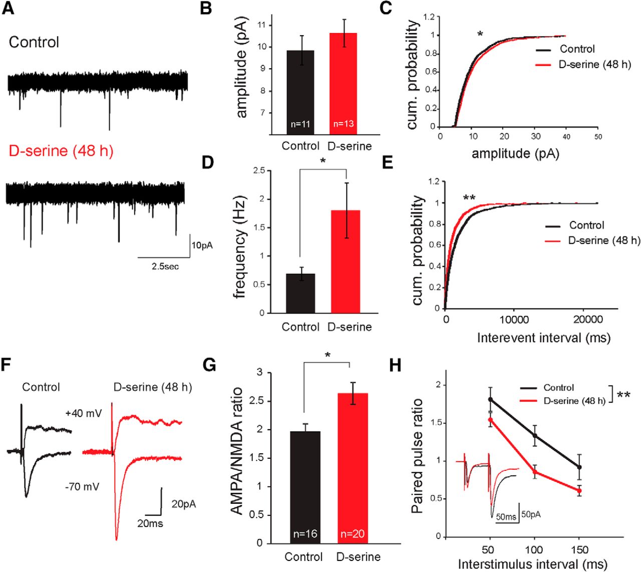 D-Serine promotes synaptic maturation at retinotectal synapses. A, Example AMPAR-mediated mEPSC traces recorded from tectal neurons in a control animal (top) and an animal exposed to d-serine for 48 h (bottom). B, AMPAR-mEPSCs from neurons in control animals (black) and in animals exposed to d-serine (100 μm) for 48 h (red) did not reveal a significant shift in mean amplitude (p = 0.21, Student's t test). C, The distribution of mEPSC amplitudes (100 randomly selected events per cell) shows a modest rightward shift in the cumulative probability plot. *p < 0.05 (Kolmogorov–Smirnoff test). D, AMPAR-mEPSC frequency increased dramatically in d-serine-exposed cells. *p < 0.05 (Mann–Whitney test). This was also reflected in the leftward shift of (E) the interevent interval distributions. **p < 0.001 (Kolmogorov–Smirnoff test). F, Example traces from tectal cell recordings of AMPAR (−70 mV) and NMDAR (40 mV) responses to optic chiasm stimulation in control and d-serine-treated (100 μm for 48 h) animals. G, Average AMPA-to-NMDA ratio of retinotectal synaptic responses was increased by d-serine (100 μm for 48 h) treatment. H, Average PPR (EPSC2/EPSC1) across a range of ISIs for control and animals raised in d-serine for 48 h. **p < 0.01 (two-way ANOVA). Inset, Example of AMPAR-mediated EPSCs recorded with a 50 ms ISI paired pulse protocol in control and in 48 h d-serine-treated (red) animals. |