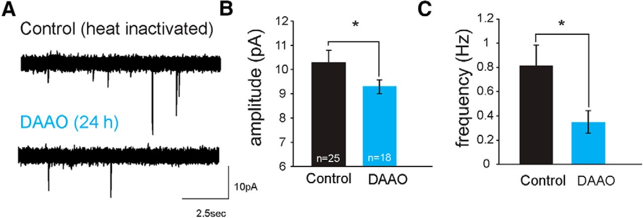 Reduced levels of d-serine lead to deficits in synaptic maturation. A, Example AMPAR mEPSC traces recorded from neurons in a control (top) and an animal injected intraventricularly with RgDAAO 24 h before recording (bottom). Average AMPAR mEPSC amplitudes (B) and (C) frequencies are reduced in animals treated with RgDAAO (blue), recorded 24 h after RgDAAO injection. Control animals were injected with heat-inactivated RgDAAO. *p < 0.05 (Mann–Whitney test). |
