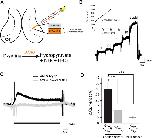 In situ detection of d-serine release in the optic tectum. A, Schematic of the placement of the d-serine biosensor into the neuropil of the optic tectum adjacent to the tectal cell body layer. d-Serine reacts with immobilized DAAO on the probe, degrading into hydroxypyruvate, ammonia, and hydrogen peroxide, which is oxidized at the biased platinum surface. B, Example calibration of biosensor with standard d-serine solutions (1, 2.5, 5 10, 20 μm) perfused into the recording chamber. Slope of the calibration curve for each experiment was used to calculate released d-serine concentrations. C, d-Serine release was stimulated by perfusing external solution containing AMPA (100 μm) with cyclothiazide (50 μm) to activate AMPARs and to block receptor desensitization, respectively. D, Average change in current detected by the d-serine or control null sensor during the last 2 min after wash-on of AMPA and cyclothiazide (black, d-serine sensor: n = 11; null sensor: n = 7) or AMPA, cyclothiazide, and NBQX (gray, d-serine sensor: n = 7). **p = 0.01, AMPA versus AMPA + NBQX (t test). ***p = 0.0015, AMPA versus null + AMPA (t test). |